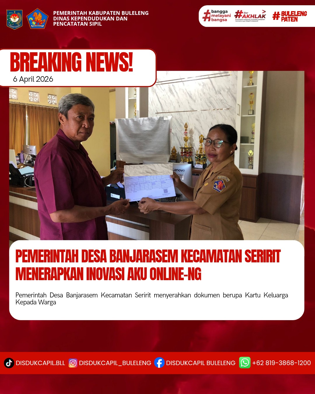 Pemerintah Kabupaten Buleleng melalui Dinas Kependudukan dan Pecatatan Sipil (Disdukcapil) Kabupaten Buleleng memaksimalkan serta mempermudah pelayanan kependudukan masyarakat dengan beberapa inovasi, melalui aplikasi AKU Online-NG. Dimana dalam penerapan aplikasi Aku Online-NG tersebut masyarakat tidak perlu lagi datang ke Dinas Dukcapil untuk melakukan pelayanan langsung, cukup dengan datang ke Desa nanti akan dibantu oleh operator Desa masing-masing. Di Desa Banjarasem Kecamatan Seririt, telah diserahkan dokumen kependudukan berupa Kartu Keluarga karena perubahan data atas nama I MADE MANGKU warga Banjar Dinas Yehanakan Desa Banjarasem yang diserahkan langsung oleh kaur TU dan UMUM, Desa Banjarasem, Kecamatan Seririt Senin (6/4).