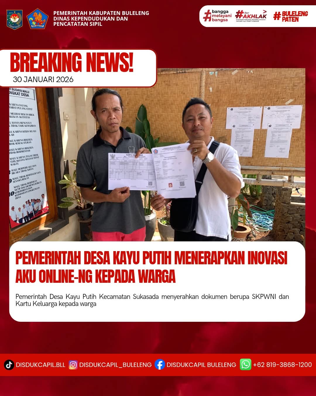 Pemerintah Kabupaten Buleleng melalui Dinas Kependudukan dan Pecatatan Sipil (Disdukcapil) Kabupaten Buleleng memaksimalkan serta mempermudah pelayanan kependudukan masyarakat dengan beberapa inovasi, melalui aplikasi AKU Online-NG. Dimana dalam penerapan aplikasi Aku Online-NG tersebut masyarakat tidak perlu lagi datang ke Dinas Dukcapil untuk melakukan pelayanan langsung cukup dengan datang ke Desa nanti akan dibantu oleh operator Desa masing-masing. Di Desa Kayu Putih Kecamatan Sukasada, telah diserahkan dokumen kependudukan berupa SKPWNI atas nama Kadek Sulistyadewi dan Kartu Keluarga atas nama Kadek Suarsana warga Banjar Dinas Sinalud, Desa Kayu Putih, Kecamatan Sukasada yang diserahkan secara langsung oleh Kelian Banjar Dinas Kayuputih Desa Kayu Putih Kecamatan Sukasada, Jumat (30/1).