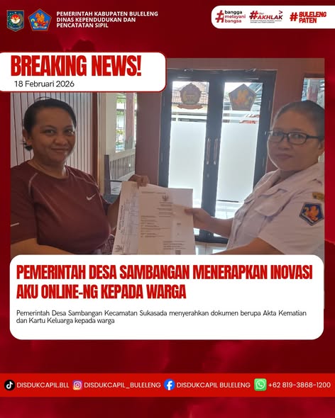 Pemerintah Kabupaten Buleleng melalui Dinas Kependudukan dan Pecatatan Sipil (Disdukcapil) Kabupaten Buleleng memaksimalkan serta mempermudah pelayanan kependudukan masyarakat dengan beberapa inovasi, melalui aplikasi AKU Online-NG. Dimana dalam penerapan aplikasi Aku Online-NG tersebut masyarakat tidak perlu lagi datang ke Dinas Dukcapil untuk melakukan pelayanan langsung cukup dengan datang ke Desa nanti akan dibantu oleh operator Desa masing-masing. Di Desa Sambangan Kecamatan Sukasada, telah diserahkan dokumen kependudukan berupa Akta Kematian atas nama Ketut Rahayuni dan Kartu Keluarga atas nama Made Sridana diserahkan oleh Kasi Pemerintahan Desa Sambangan bertempat di Kantor Perbekel Desa Sambangan, Kecamatan Sukasada, Kabupaten Buleleng, Rabu (18/2).