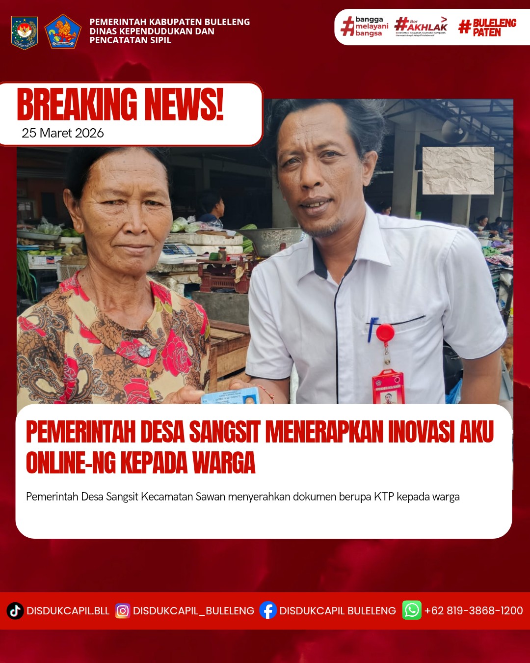 Pemerintah Kabupaten Buleleng melalui Dinas Kependudukan dan Pecatatan Sipil (Disdukcapil) Kabupaten Buleleng memaksimalkan serta mempermudah pelayanan kependudukan masyarakat dengan beberapa inovasi, melalui aplikasi AKU Online-NG. Dimana dalam penerapan aplikasi Aku Online-NG tersebut masyarakat tidak perlu lagi datang ke Dinas Dukcapil untuk melakukan pelayanan langsung cukup dengan datang ke Desa nanti akan dibantu oleh operator Desa masing-masing. Di Desa Sangsit Kecamatan Sawan, telah diserahkan dokumen kependudukan berupa KTP atas nama Nyoman Sudarmi warga Banjar Dinas Sema, Desa Sangsit yang diserahkan oleh Kasi Pemerintahan Desa Sangsit di Desa Sangsit, Kecamatan Sawan, Kabupaten Buleleng, Rabu (25/3).