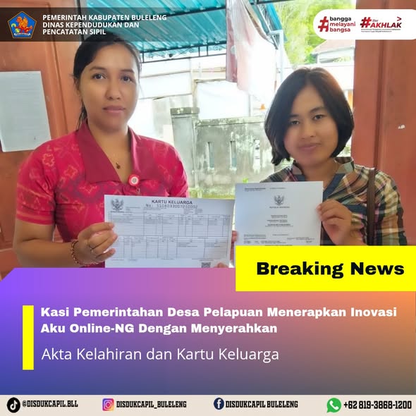 Pemerintah Kabupaten Buleleng melalui Dinas Kependudukan dan Pecatatan Sipil (Disdukcapil) Kabupaten Buleleng memaksimalkan serta mempermudah pelayanan kependudukan masyarakat dengan beberapa inovasi, melalui aplikasi AKU Online-NG. Dimana dalam penerapan aplikasi Aku Online-NG tersebut masyarakat tidak perlu lagi datang ke Dinas Dukcapil untuk melakukan pelayanan langsung cukup dengan datang ke Desa nanti akan dibantu oleh operator Desa masing-masing. Di Desa Pelapuan Kecamatan Busungbiu, telah diserahkan dokumen kependudukan berupa Akta Kelahiran dan Kartu Keluarga atas nama I Dewa Nyoman Trisna Dipayana yang diserahkan oleh Kasi Pemerintahan Desa Pelapuan kepada warga bertempat di Kantor Perbekel Desa Pelapuan, Kecamatan Busungbiu, Kabupaten Buleleng, Selasa (23/12).