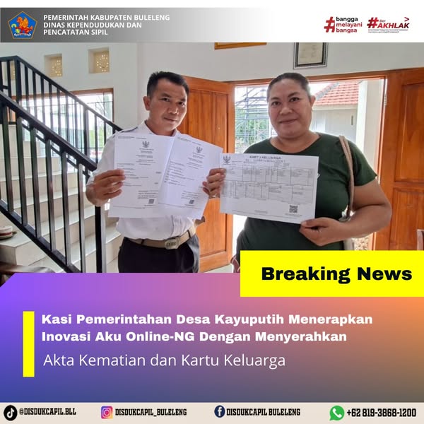 Pemerintah Kabupaten Buleleng melalui Dinas Kependudukan dan Pecatatan Sipil (Disdukcapil) Kabupaten Buleleng memaksimalkan serta mempermudah pelayanan kependudukan masyarakat dengan beberapa inovasi, melalui aplikasi AKU Online-NG. Dimana dalam penerapan aplikasi Aku Online-NG tersebut masyarakat tidak perlu lagi datang ke Dinas Dukcapil untuk melakukan pelayanan langsung cukup dengan datang ke Desa nanti akan dibantu oleh operator Desa masing-masing. Di Desa Kayuputih Kecamatan Sukasada, telah diserahkan dokumen kependudukan berupa Akta Kematian atas nama Nengah Purining dan Jro Made Darmadi dan Kartu Keluarga atas nama Jro Gede Putra Aryasa yang diserahkan langsung oleh Kasi Pemerintahan Desa Kayuputih Kecamatan Sukasada bertempat di kantor Perbekel Desa Kayuputih, Kecamatan Sukasada, Kabupaten Buleleng, Rabu (17/9).