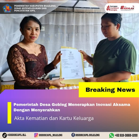 Pemerintah Kabupaten Buleleng melalui Dinas Kependudukan dan Pecatatan Sipil (Disdukcapil) Kabupaten Buleleng memaksimalkan serta mempermudah pelayanan kependudukan masyarakat dengan beberapa inovasi, yakni BALITA (Bayi Lahir Berakta), NYAKSI (Menyerahkan Akta Kawin Saat Acara Perkawinan) dan AKSAMA ( Akta Kematian Diserahkan Saat Masih Berduka) melalui aplikasi Aku Online. Di Desa Gobleg Kecamatan Banjar, telah diterapkan program Aksama (Akta Kematian Diserahkan Saat Masih Berduka) yang dilakukan secara langsung oleh Staf Administrasi Desa Gobleg dengan menyerahkan Akta Kematian atas nama Wayan Terima dan Kartu Keluarga kepada pihak keluarga almarhum di Desa Gobleg, Kamis (11/12).