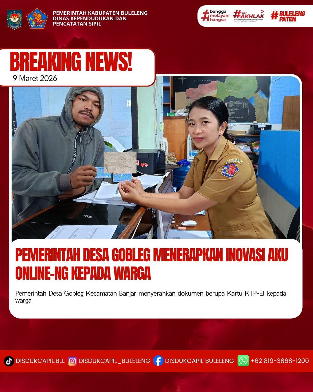 Pemerintah Kabupaten Buleleng melalui Dinas Kependudukan dan Pecatatan Sipil (Disdukcapil) Kabupaten Buleleng memaksimalkan serta mempermudah pelayanan kependudukan masyarakat dengan beberapa inovasi, melalui aplikasi AKU Online-NG. Dimana dalam penerapan aplikasi Aku Online-NG tersebut masyarakat tidak perlu lagi datang ke Dinas Dukcapil untuk melakukan pelayanan langsung cukup dengan datang ke Desa nanti akan dibantu oleh operator Desa masing-masing. Di Desa Gobleg Kecamatan Banjar, telah diserahkan dokumen kependudukan berupa KTP-El atas nama Komang Astrawan dan Komang Widiantari yang diserahkan langsung oleh staf administrasi Desa Gobleg bertempat di Kantor Perbekel Desa Gobleg, Kecamatan Banjar, Kabupaten Buleleng, Senin (9/3).