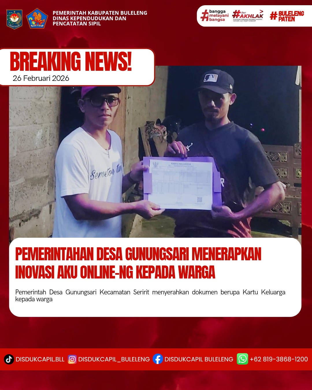 Pemerintah Kabupaten Buleleng melalui Dinas Kependudukan dan Pecatatan Sipil (Disdukcapil) Kabupaten Buleleng memaksimalkan serta mempermudah pelayanan kependudukan masyarakat dengan beberapa inovasi, melalui aplikasi AKU Online-NG. Dimana dalam penerapan aplikasi Aku Online-NG tersebut masyarakat tidak perlu lagi datang ke Dinas Dukcapil untuk melakukan pelayanan langsung cukup dengan datang ke Desa nanti akan dibantu oleh operator Desa masing-masing. Di Desa Gunungsari Kecamatan Seririt, telah diserahkan dokumen kependudukan berupa Kartu Keluarga atas nama KADEK SUGIARTA dan KETUT DARTI warga Banjar Dinas Sekar, Desa Gunungsari yang diserahkan oleh Pemerintah Desa Gunungsari kepada warga bertempat di Kantor Perbekel Desa Gunungsari, Kecamatan Seririt, Kabupaten Buleleng, Kamis (26/2).