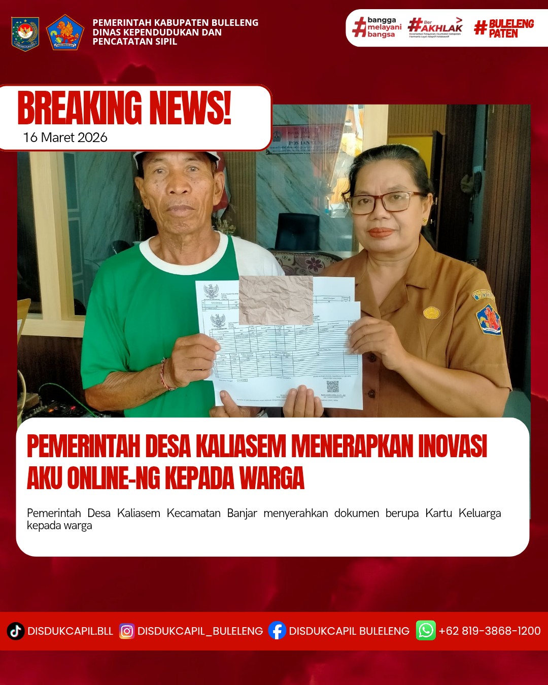 Pemerintah Kabupaten Buleleng melalui Dinas Kependudukan dan Pecatatan Sipil (Disdukcapil) Kabupaten Buleleng memaksimalkan serta mempermudah pelayanan kependudukan masyarakat dengan beberapa inovasi, melalui aplikasi AKU Online. Dimana dalam penerapan aplikasi Aku Online tersebut masyarakat tidak perlu lagi datang ke Dinas Dukcapil untuk melakukan pelayanan langsung cukup dengan datang ke Desa nanti akan dibantu oleh operator Desa masing-masing. Di Desa Kaliasem Kecamatan Banjar telah diserahkan dokumen kependudukan berupa Kartu Keluarga atas nama Ketut Yasa yang diserahkan oleh Kasi Pemerintahan Desa Kaliasem, Senin (16/3).