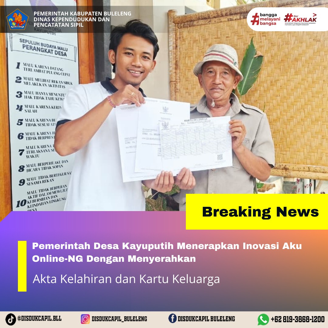 Pemerintah Kabupaten Buleleng melalui Dinas Kependudukan dan Pecatatan Sipil (Disdukcapil) Kabupaten Buleleng memaksimalkan serta mempermudah pelayanan kependudukan masyarakat dengan beberapa inovasi, melalui aplikasi AKU Online-NG. Dimana dalam penerapan aplikasi Aku Online-NG tersebut masyarakat tidak perlu lagi datang ke Dinas Dukcapil untuk melakukan pelayanan langsung cukup dengan datang ke Desa nanti akan dibantu oleh operator Desa masing-masing. Di Desa Kayuputih Kecamatan Sukasada, telah diserahkan dokumen kependudukan berupa Akta Kelahiran atas nama Ketut Ginana dan Ketut Nasih dan Kartu Keluarga atas nama Ketut Ginana warga Banjar Dinas Kayuputih, Desa Kayu Putih yang diserahkan secara langsung oleh Kasi Pelayanan Desa Kayuputih Kecamatan Sukasada, Rabu (31/12).