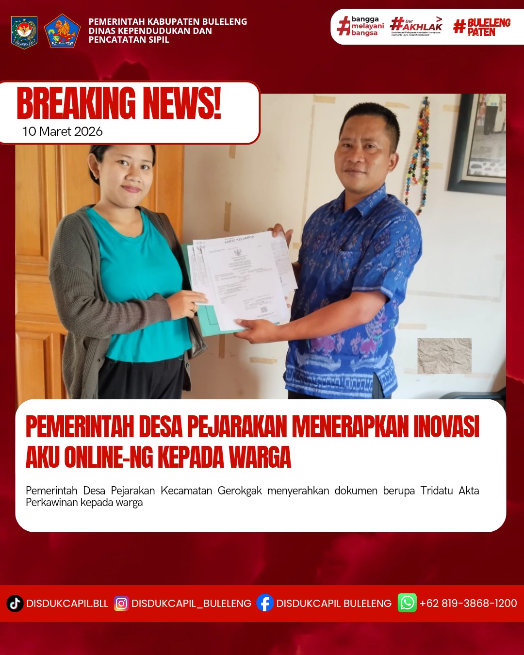 Pemerintah Kabupaten Buleleng melalui Dinas Kependudukan dan Pecatatan Sipil (Disdukcapil) Kabupaten Buleleng memaksimalkan serta mempermudah pelayanan kependudukan masyarakat dengan beberapa inovasi, melalui aplikasi AKU Online-NG. Dimana dalam penerapan aplikasi Aku Online-NG tersebut masyarakat tidak perlu lagi datang ke Dinas Dukcapil untuk melakukan pelayanan langsung cukup dengan datang ke Desa nanti akan dibantu oleh operator Desa masing-masing. Di Desa Pejarakan Kecamatan Gerokgak, telah diserahkan dokumen kependudukan berupa Akta Perkawinan atas nama Nengah Suardika dengan Luh Sri Wahyuni dan Kartu Keluarga yang diserahkan langsung oleh Kasi Pemerintahan Desa Pejarakan bertempat di Kantor Perbekel Desa Pejarakan, Kecamatan Gerokgak, Kabupaten Buleleng, Selasa (10/3).