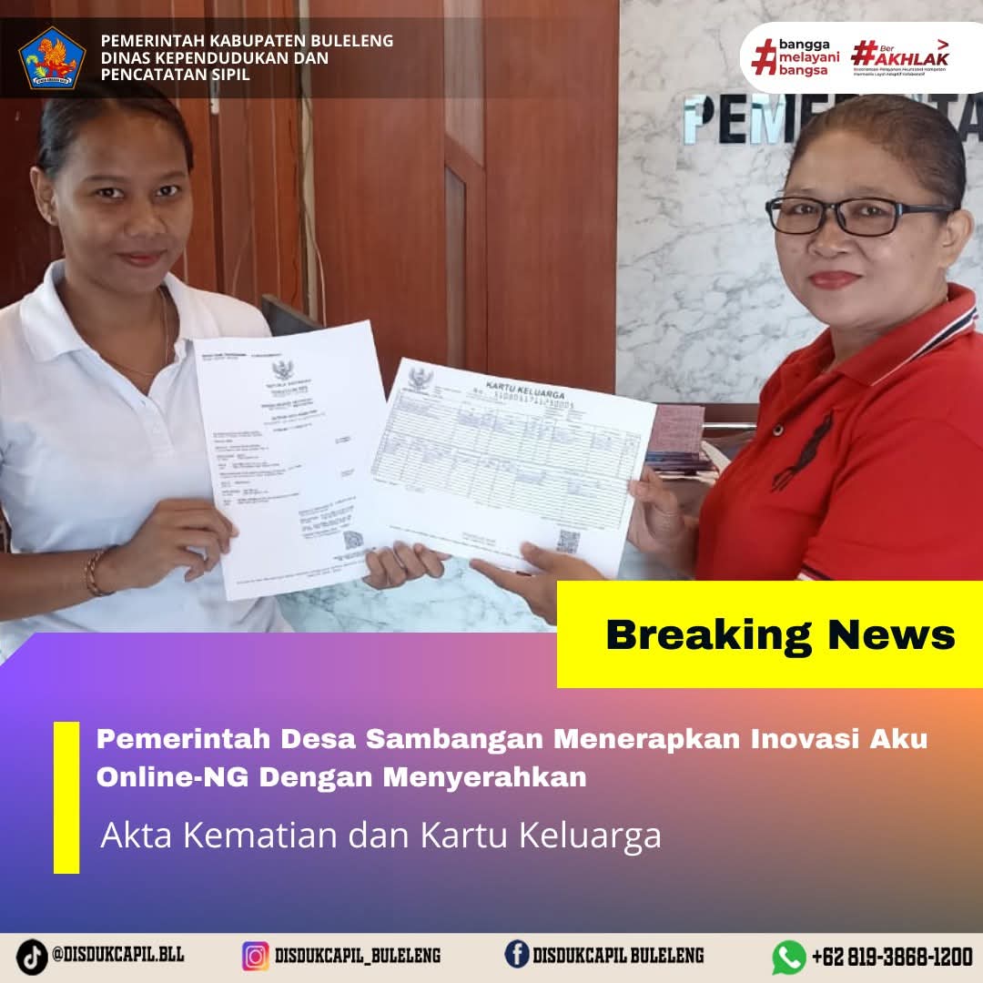 Pemerintah Kabupaten Buleleng melalui Dinas Kependudukan dan Pecatatan Sipil (Disdukcapil) Kabupaten Buleleng memaksimalkan serta mempermudah pelayanan kependudukan masyarakat dengan beberapa inovasi, melalui aplikasi AKU Online-NG. Dimana dalam penerapan aplikasi Aku Online-NG tersebut masyarakat tidak perlu lagi datang ke Dinas Dukcapil untuk melakukan pelayanan langsung cukup dengan datang ke Desa nanti akan dibantu oleh operator Desa masing-masing. Di Desa Sambangan Kecamatan Sukasada, telah diserahkan dokumen kependudukan berupa Akta Kematian atas nama Luh Yase dan Kartu Keluarga atas nama Pontianus Ade Johari yang diserahkan oleh Kasi Pemerintahan Desa Sambangan kepada warga bertempat di Kantor Perbekel Desa Sambangan, Kecamatan Sukasada, Kabupaten Buleleng, Jumat (21/11).