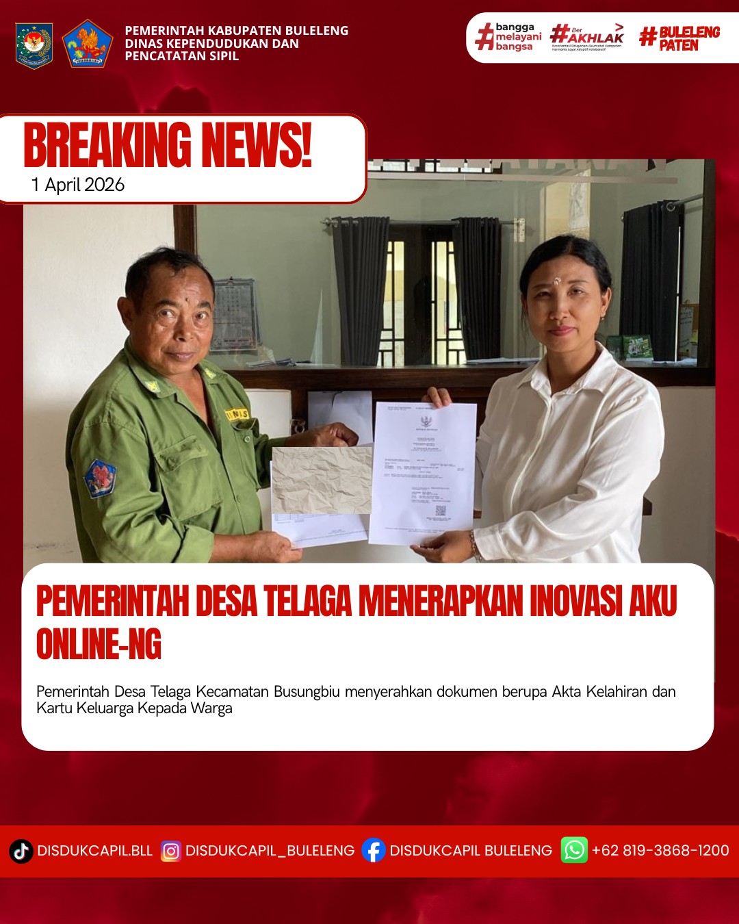 Pemerintah Kabupaten Buleleng melalui Dinas Kependudukan dan Pecatatan Sipil (Disdukcapil) Kabupaten Buleleng memaksimalkan serta mempermudah pelayanan kependudukan masyarakat dengan beberapa inovasi, melalui aplikasi AKU Online-NG. Dimana dalam penerapan aplikasi Aku Online-NG tersebut masyarakat tidak perlu lagi datang ke Dinas Dukcapil untuk melakukan pelayanan langsung cukup dengan datang ke Desa nanti akan dibantu oleh operator Desa masing-masing. Di Desa Telaga Kecamatan Busungbiu, telah diserahkan dokumen kependudukan berupa Akta Kelahiran dan Kartu Keluarga atas nama Ketut Tarsa yang diserahkan langsung oleh Staf Desa Telaga bertempat di Kantor Perbekel Desa Telaga yang beralamat di Banjar Dinas Kumuda Loka Desa Telaga Kecamatan Busungbiu Kabupaten Buleleng, Rabu (1/4).