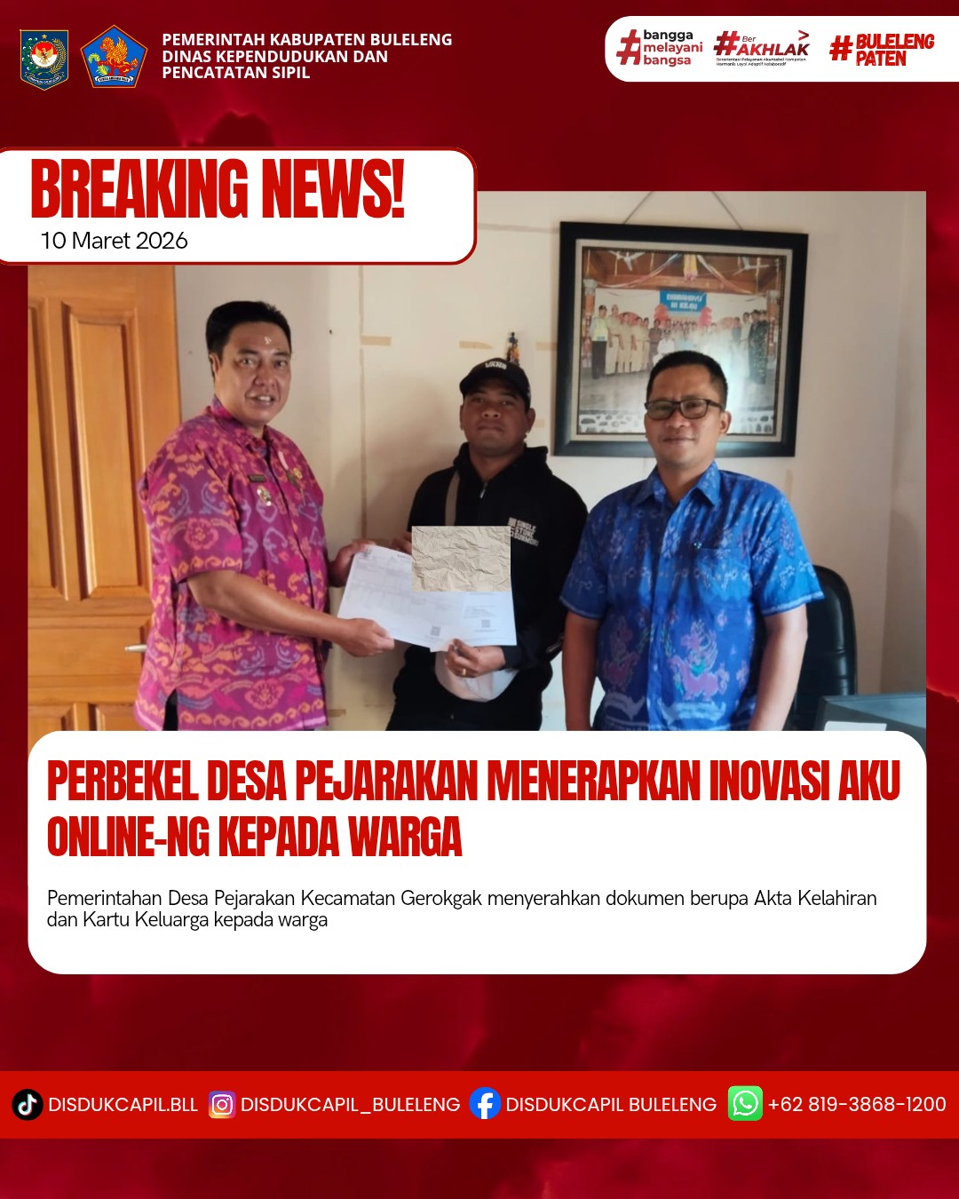 Pemerintah Kabupaten Buleleng melalui Dinas Kependudukan dan Pecatatan Sipil (Disdukcapil) Kabupaten Buleleng memaksimalkan serta mempermudah pelayanan kependudukan masyarakat dengan beberapa inovasi, melalui aplikasi AKU Online-NG. Dimana dalam penerapan aplikasi Aku Online-NG tersebut masyarakat tidak perlu lagi datang ke Dinas Dukcapil untuk melakukan pelayanan langsung cukup dengan datang ke Desa nanti akan dibantu oleh operator Desa masing-masing. Di Desa Pejarakan Kecamatan Gerokgak, telah diserahkan dokumen kependudukan berupa Akta Kelahiran atas nama Komang Reyshaka D. P dan Kartu Keluarga atas nama Gede Suparma kepada warga yang diserahkan langsung oleh Perbekel Desa Pejarakan I Made Astawa bertempat di kantor Perbekel Desa Pejarakan, Kecamatan Gerokgak, Kabupaten Buleleng, Selasa (10/3).