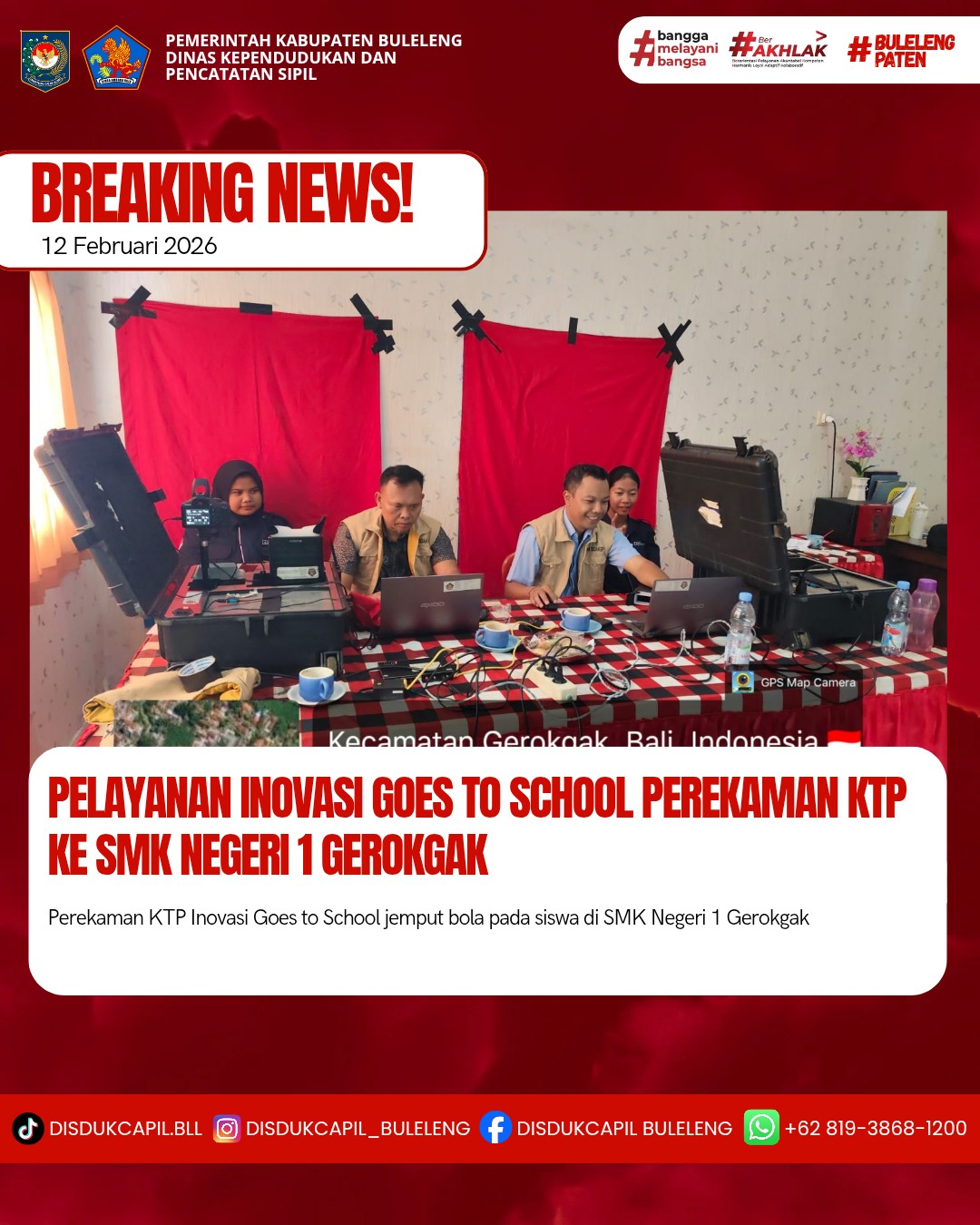 Pada kali ini Kamis, 12 Februari 2026 pelayanan perekaman KTP-el dilaksanakan di SMK Negeri 1 Gerokgak. Hasil perekaman di SMK Negeri 1 Gerokgak dengan data BNBA sebanyak 234 orang dan total yang melakukan perekaman sebanyak 81 orang, dimana hasil perekaman data di dalam BNBA sebanyak 80 orang dan data di luar BNBA sebanyak 1 orang yang melakukan perekaman. Dilihat dari hasil tersebut sisa data BNBA yang belum perekaman sebanyak 154 orang keterangan dari pihak sekolah siswa yang belum perekaman masih magang di Industri.
