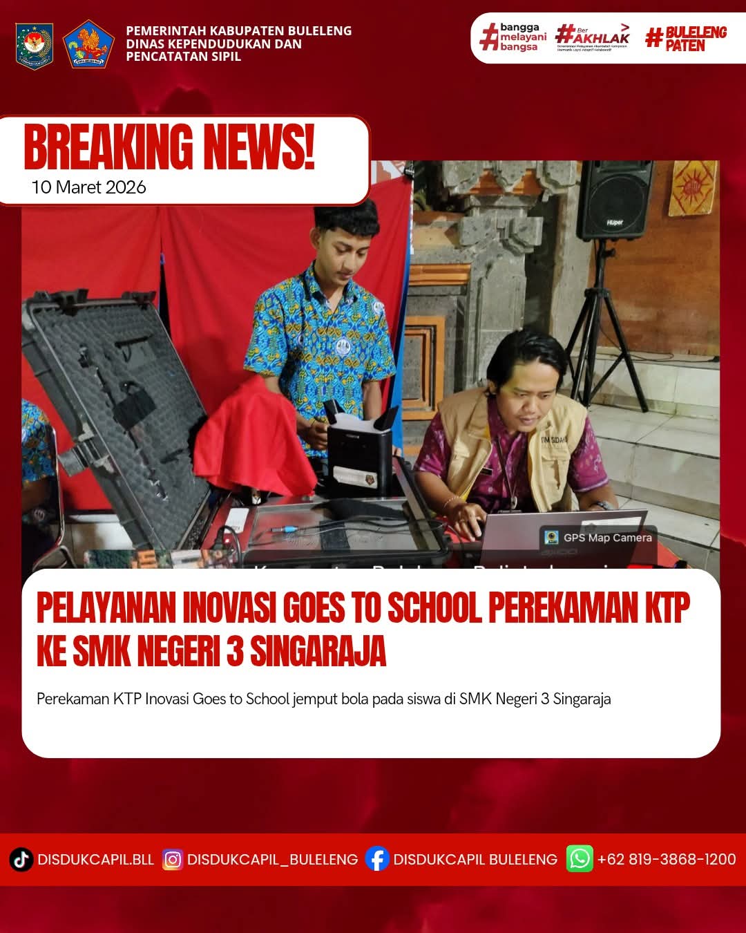 Pada kali ini Selasa, 19 Maret 2026 pelayanan perekaman KTP-el dilaksanakan di SMK Negeri 3 Singaraja. Hasil perekaman di SMK Negeri 3 Singaraja dengan data BNBA sebanyak 185 orang dan total yang melakukan perekaman sebanyak 78 orang, dimana hasil perekaman data di dalam BNBA sebanyak 78 orang dan tidak ada data diluar BNBA yang melakukan perekaman. Dilihat dari hasil tersebut sisa data BNBA yang belum perekaman sebanyak 107 orang keterangan dari pihak sekolah untuk sisa BNBA dilanjutkan hari berikutnya.