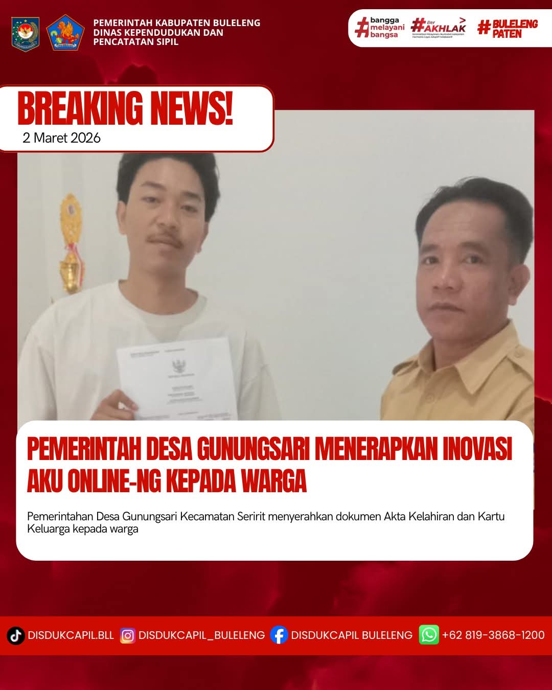 Pemerintah Kabupaten Buleleng melalui Dinas Kependudukan dan Pecatatan Sipil (Disdukcapil) Kabupaten Buleleng memaksimalkan serta mempermudah pelayanan kependudukan masyarakat dengan beberapa inovasi, melalui aplikasi AKU Online-NG. Dimana dalam penerapan aplikasi Aku Online-NG tersebut masyarakat tidak perlu lagi datang ke Dinas Dukcapil untuk melakukan pelayanan langsung cukup dengan datang ke Desa nanti akan dibantu oleh operator Desa masing-masing. Di Desa Gunungsari Kecamatan Seririt, telah diserahkan dokumen kependudukan berupa Akta Kelahiran atas nama Gede Yogi Widiana Putra dan Kartu Keluarga atas nama I Putu Gitawan warga Banjar Dinas Puspajati, Desa Gunungsari yang diserahkan oleh Pemerintah Desa Gunungsari kepada warga Banjar Dinas Sekar Desa Puspajati, bertempat di Kantor Perbekel Desa Gunungsari, Kecamatan Seririt, Kabupaten Buleleng, Senin (2/3).