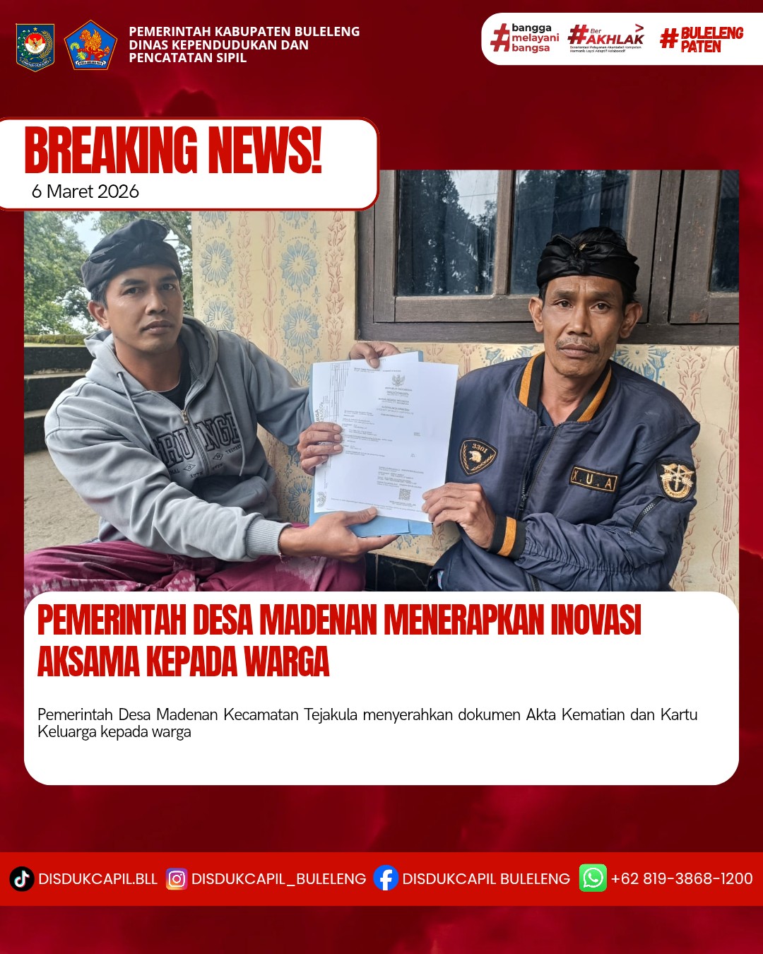 Pemerintah Kabupaten Buleleng melalui Dinas Kependudukan dan Pecatatan Sipil (Disdukcapil) Kabupaten Buleleng memaksimalkan serta mempermudah pelayanan kependudukan masyarakat dengan beberapa inovasi, yakni BALITA (Bayi Lahir Berakta), NYAKSI (Menyerahkan Akta Kawin Saat Acara Perkawinan) dan AKSAMA ( Akta Kematian Diserahkan Saat Masih Berduka) melalui aplikasi Aku Online. Di Desa Madenan Kecamatan Tejakula, telah diterapkan program Aksama (Akta Kematian Diserahkan Saat Masih Berduka) yang dilakukan secara langsung oleh Pemerintah Desa Madenan dengan menyerahkan Akta Kematian atas nama KETUT ARSA dan Kartu Keluarga beralamat di rumah duka di Banjar Dinas Keduran, Desa Madenan oleh KBD Keduran, Desa Madenan Kecamatan Tejakula, Jumat (6/3).