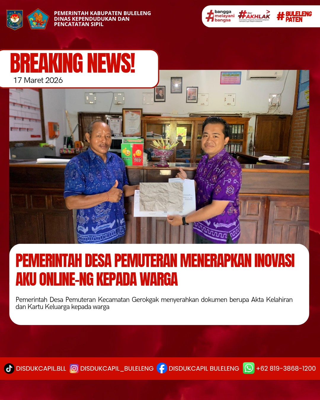 Pemerintah Kabupaten Buleleng melalui Dinas Kependudukan dan Pecatatan Sipil (Disdukcapil) Kabupaten Buleleng memaksimalkan serta mempermudah pelayanan kependudukan masyarakat dengan beberapa inovasi, melalui aplikasi AKU Online-NG. Dimana dalam penerapan aplikasi Aku Online-NG tersebut masyarakat tidak perlu lagi datang ke Dinas Dukcapil untuk melakukan pelayanan langsung cukup dengan datang ke Desa nanti akan dibantu oleh operator Desa masing-masing. Di Desa Pemuteran Kecamatan Gerokgak, telah diserahkan dokumen kependudukan berupa Tridatu Akta Kelahiran yang diserahkan langsung oleh Kasi Pemerintahan Desa Pemuteran, Selasa (17/3).