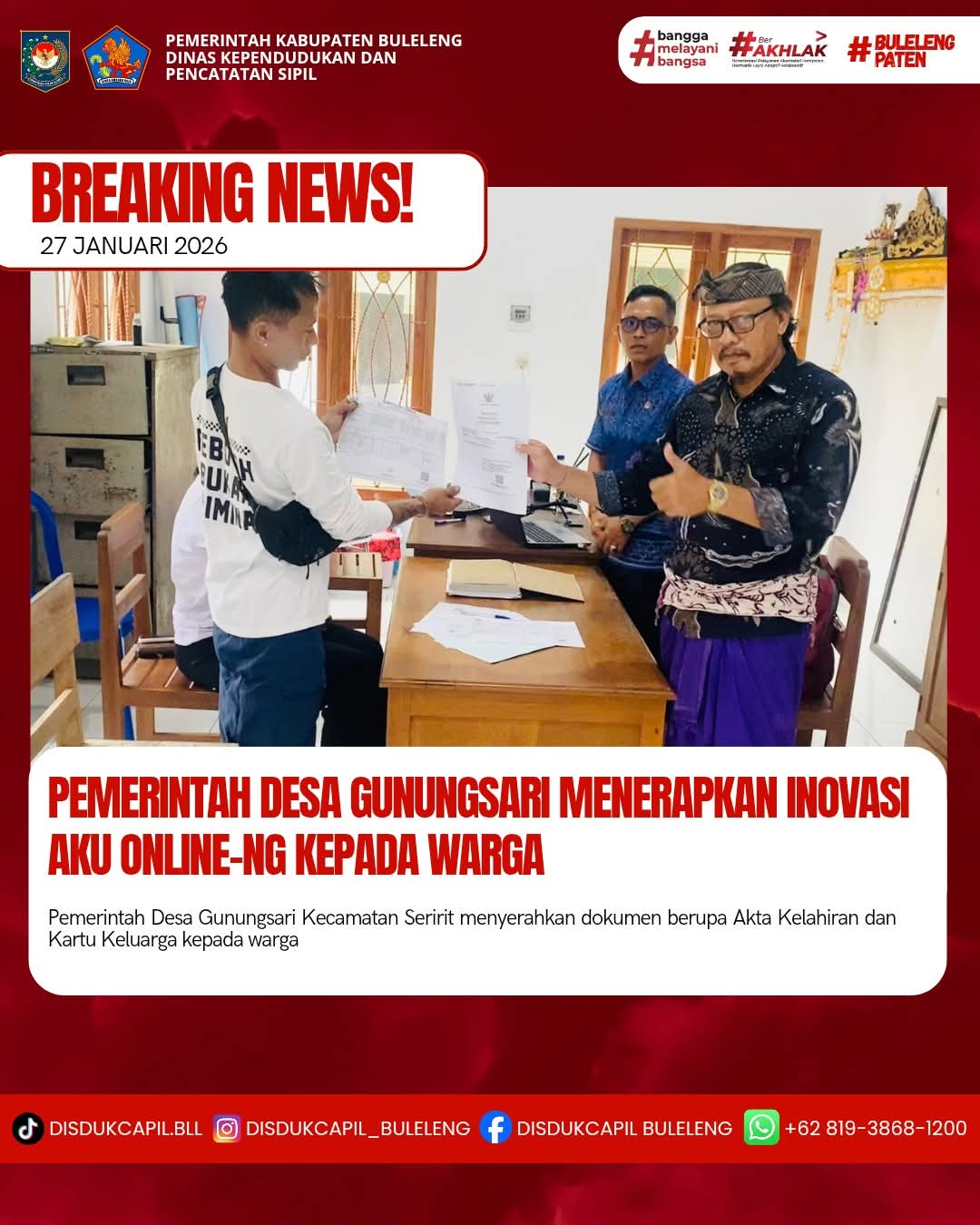 Pemerintah Kabupaten Buleleng melalui Dinas Kependudukan dan Pecatatan Sipil (Disdukcapil) Kabupaten Buleleng memaksimalkan serta mempermudah pelayanan kependudukan masyarakat dengan beberapa inovasi, melalui aplikasi AKU Online-NG. Dimana dalam penerapan aplikasi Aku Online-NG tersebut masyarakat tidak perlu lagi datang ke Dinas Dukcapil untuk melakukan pelayanan langsung cukup dengan datang ke Desa nanti akan dibantu oleh operator Desa masing-masing. Di Desa Gunungsari Kecamatan Seririt, telah diserahkan dokumen kependudukan berupa Akta Kelahiran atas nama I Kadek Devan Pradipta dan Kartu Keluarga atas nama I Nengah Setiawan yang diserahkan oleh Perbekel Desa Gunungsari Ketut Pastika,SH kepada warga Banjar Dinas Sekar Desa Gunungsari, bertempat di Kantor Perbekel Desa Gunungsari, Kecamatan Seririt, Kabupaten Buleleng, Selasa (27/1).