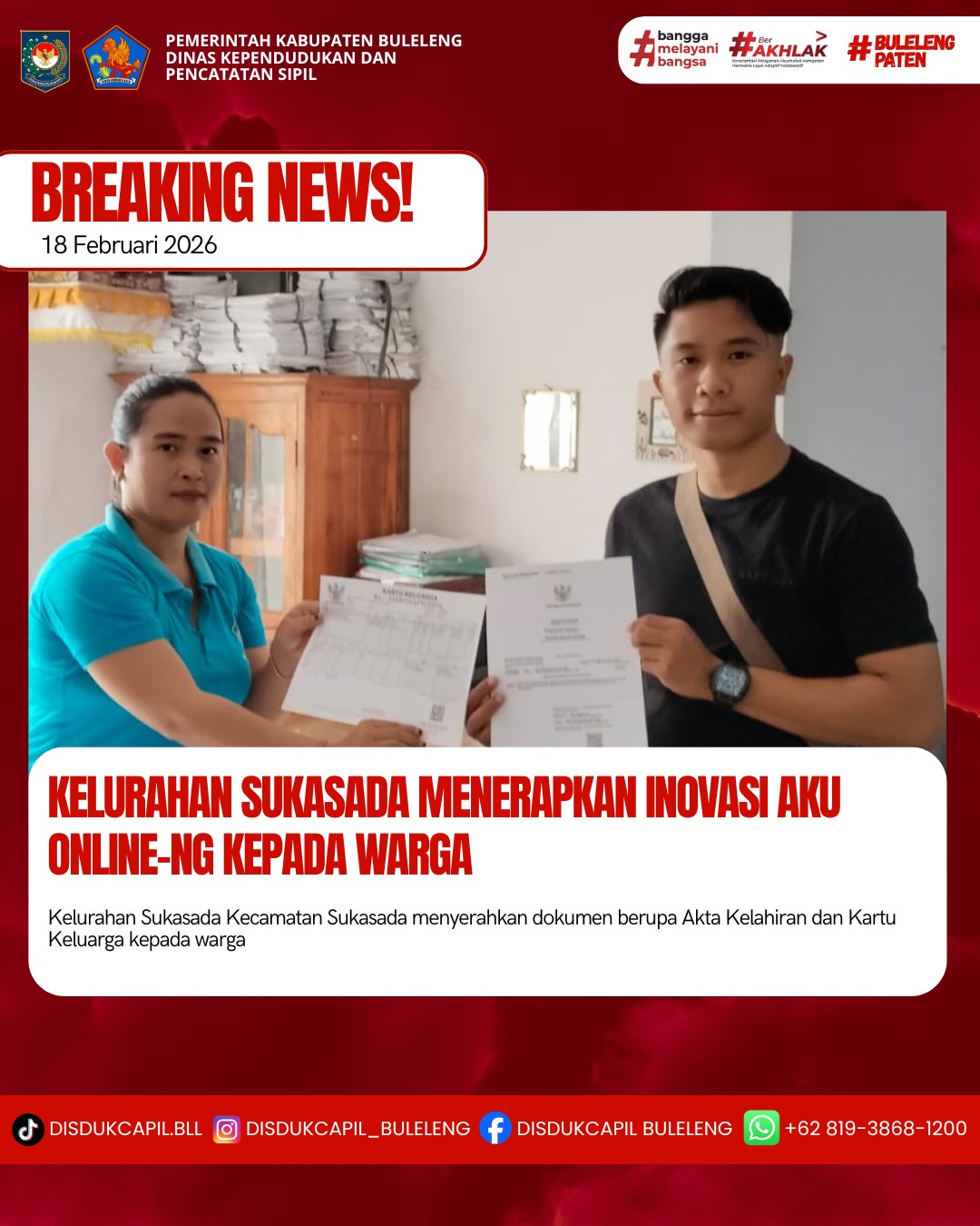 Pemerintah Kabupaten Buleleng melalui Dinas Kependudukan dan Pecatatan Sipil (Disdukcapil) Kabupaten Buleleng memaksimalkan serta mempermudah pelayanan kependudukan masyarakat dengan beberapa inovasi, melalui aplikasi AKU Online-NG. Dimana dalam penerapan aplikasi Aku Online-NG tersebut masyarakat tidak perlu lagi datang ke Dinas Dukcapil untuk melakukan pelayanan langsung cukup dengan datang ke Desa nanti akan dibantu oleh operator Desa masing-masing. Di Kelurahan Sukasada Kecamatan Sukasada, telah diserahkan dokumen kependudukan berupa Akta Kelahiran dan Kartu Keluarga atas nama I Made Adi Suhartana warga Lingkungan Bakung, Kelurahan Sukasada yang diserahkan langsung oleh Operator Kelurahan Sukasada Kecamatan Sukasada, Kabupaten Buleleng, Rabu (18/2).