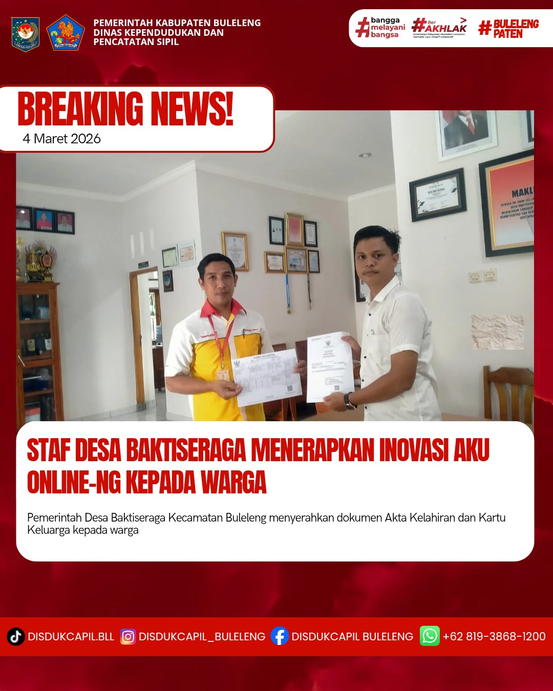 Pemerintah Kabupaten Buleleng melalui Dinas Kependudukan dan Pecatatan Sipil (Disdukcapil) Kabupaten Buleleng memaksimalkan serta mempermudah pelayanan kependudukan masyarakat dengan beberapa inovasi, melalui aplikasi AKU Online-NG. Dimana dalam penerapan aplikasi Aku Online-NG tersebut masyarakat tidak perlu lagi datang ke Dinas Dukcapil untuk melakukan pelayanan langsung cukup dengan datang ke Desa nanti akan dibantu oleh operator Desa masing-masing. Di Desa Baktiseraga Kecamatan Buleleng, telah diserahkan dokumen kependudukan berupa Akta Kelahiran yang diserahkan langsung oleh Kasi Pelayanan Desa Baktiseraga bertempat di kantor Perbekel Desa Baktiseraga, Kecamatan Buleleng, Kabupaten Buleleng, Rabu (4/3).