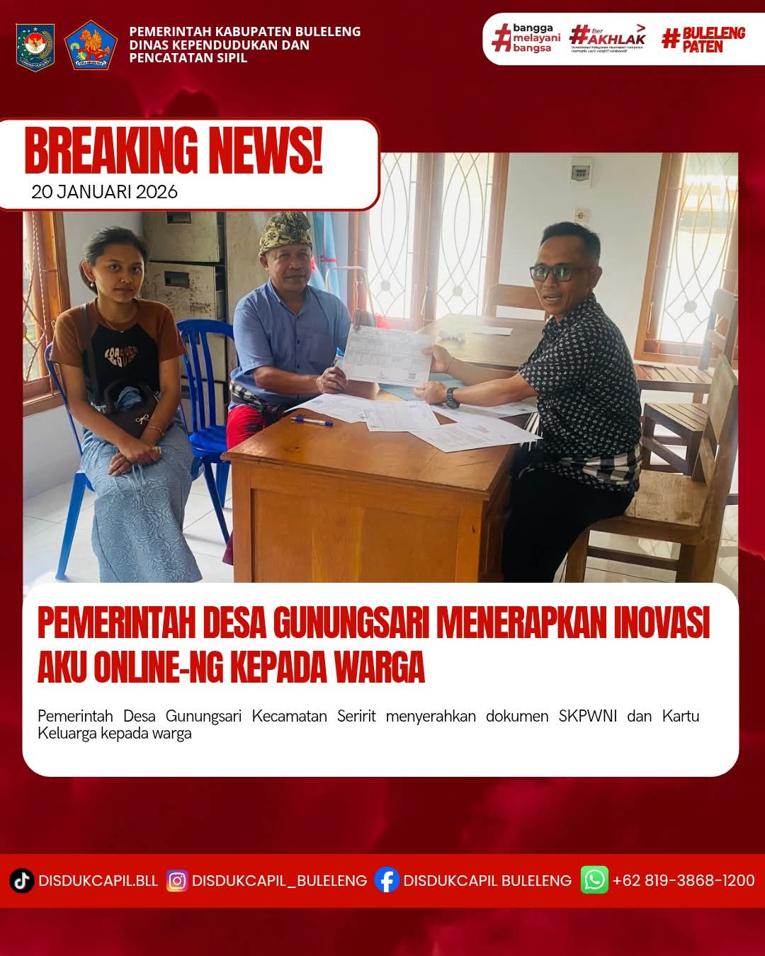 Pemerintah Kabupaten Buleleng melalui Dinas Kependudukan dan Pecatatan Sipil (Disdukcapil) Kabupaten Buleleng memaksimalkan serta mempermudah pelayanan kependudukan masyarakat dengan beberapa inovasi, melalui aplikasi AKU Online-NG. Dimana dalam penerapan aplikasi Aku Online-NG tersebut masyarakat tidak perlu lagi datang ke Dinas Dukcapil untuk melakukan pelayanan langsung cukup dengan datang ke Desa nanti akan dibantu oleh operator Desa masing-masing. Di Desa Gunungsari Kecamatan Seririt, telah diserahkan dokumen kependudukan berupa SKPWNI atas nama Putu Ayu Sri Wahyuni dan Kartu Keluarga atas nama Nyoman Darmayasa yang diserahkan oleh Pemerintah Desa Gunungsari kepada warga Banjar Dinas Sekar Desa Gunungsari, bertempat di Kantor Perbekel Desa Gunungsari, Kecamatan Seririt, Kabupaten Buleleng, Selasa (20/1).