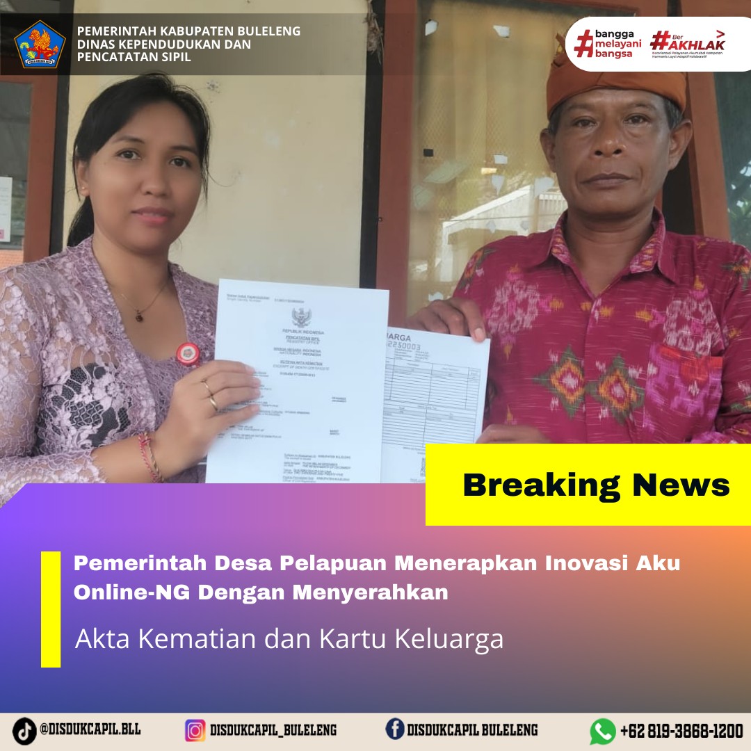 Pemerintah Kabupaten Buleleng melalui Dinas Kependudukan dan Pecatatan Sipil (Disdukcapil) Kabupaten Buleleng memaksimalkan serta mempermudah pelayanan kependudukan masyarakat dengan beberapa inovasi, melalui aplikasi AKU Online-NG. Dimana dalam penerapan aplikasi Aku Online-NG tersebut masyarakat tidak perlu lagi datang ke Dinas Dukcapil untuk melakukan pelayanan langsung cukup dengan datang ke Desa nanti akan dibantu oleh operator Desa masing-masing. Di Desa Pelapuan Kecamatan Busungbiu, telah diserahkan dokumen kependudukan berupa Akta Kematian dan Kartu Keluarga yang diserahkan oleh Kasi Pemerintahan Desa Pelapuan kepada warga bertempat di Kantor Perbekel Desa Pelapuan, Kecamatan Busungbiu, Kabupaten Buleleng, Kamis (18/12).