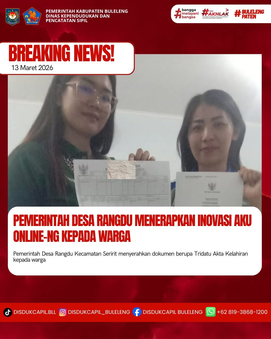Pemerintah Kabupaten Buleleng melalui Dinas Kependudukan dan Pecatatan Sipil (Disdukcapil) Kabupaten Buleleng memaksimalkan serta mempermudah pelayanan kependudukan masyarakat dengan beberapa inovasi, melalui aplikasi AKU Online. Dimana dalam penerapan aplikasi Aku Online tersebut masyarakat tidak perlu lagi datang ke Dinas Dukcapil untuk melakukan pelayanan langsung cukup dengan datang ke Desa nanti akan dibantu oleh operator Desa masing-masing. Di Desa Rangdu Kecamatan Seririt telah diserahkan dokumen kependudukan berupa Tridatu Akta Kelahiran atas nama Ni Nengah Warsih diserahkan langsung oleh Operator Desa Rangdu di Desa Rangdu Kecamatan Seririt, Jumat (13/3).