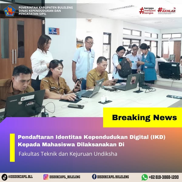 Menerapkan aturan pemerintah tersebut, Dinas Kependudukan dan Pencatatan Sipil Kabupaten Buleleng menyelenggarakan Pendaftaran Identitas Kependudukan Digital ke sekolah-sekolah, Dinas, Lembaga dan Perusahaan secara bergilir setiap harinya. Kali ini pelaksanaan pendaftaran Identitas Kependudukan Digital kepada Dosen dan Pegawai yang dilaksanakan di Fakultas Teknik dan Kejuruan Undiksha, Senin (13/10).
