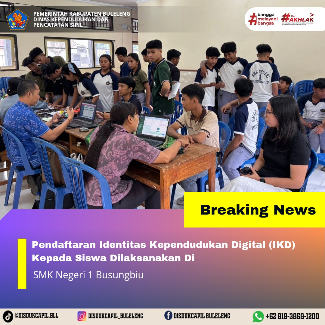 Menerapkan aturan pemerintah tersebut, Dinas Kependudukan dan Pencatatan Sipil Kabupaten Buleleng menyelenggarakan Pendaftaran Identitas Kependudukan Digital ke sekolah-sekolah, Dinas, Lembaga dan Perusahaan secara bergilir setiap harinya. Kali ini pelaksanaan pendaftaran Identitas Kependudukan Digital kepada siswa yang dilaksanakan di SMK Negeri 1 Busungbiu, Selasa (16/12).