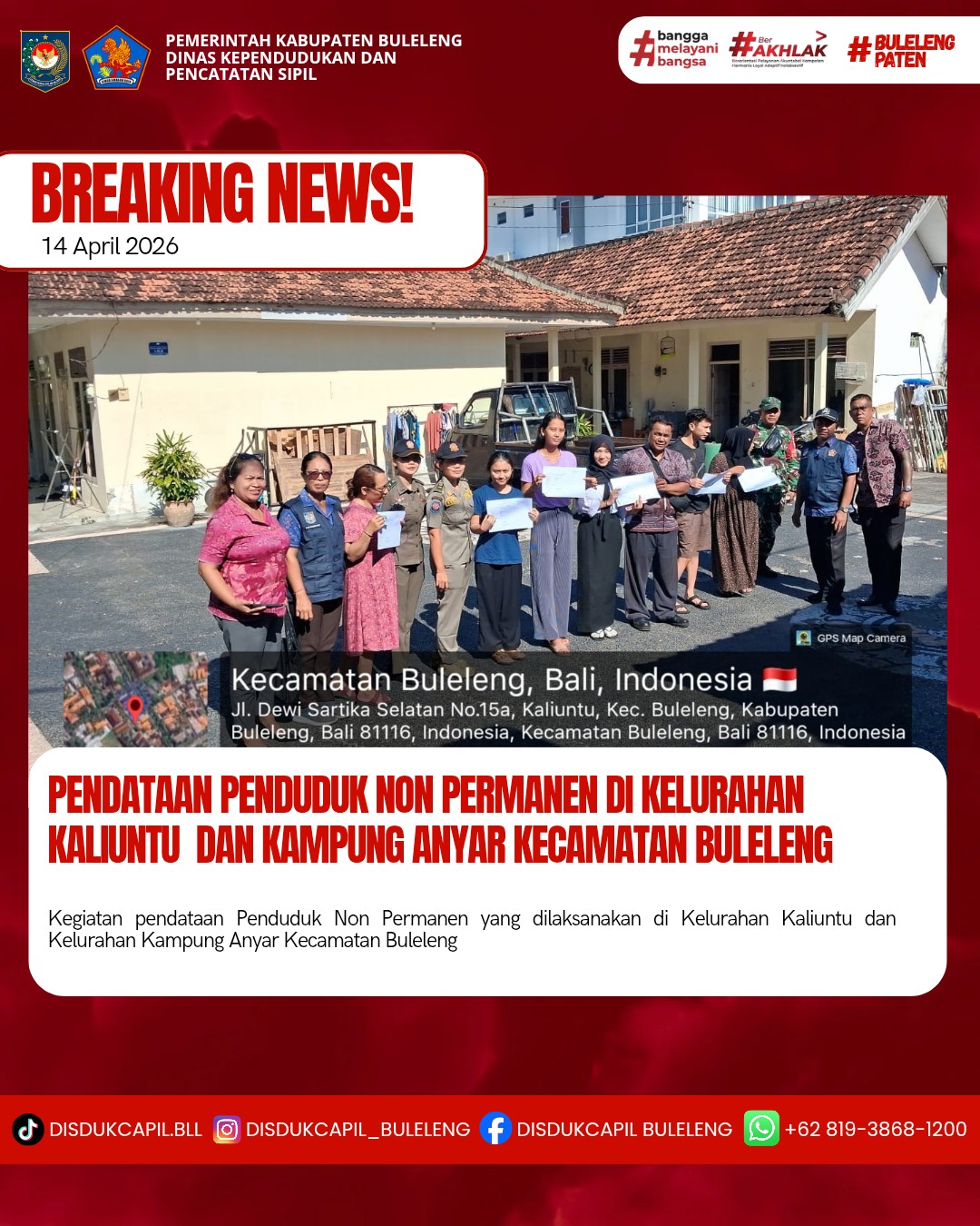 Kali ini Selasa, 14 April 2026, Dinas Kependudukan dan Pencatatan Sipil Kabupaten Buleleng melaksanakan kegiatan pendataan penduduk Non Permanen di Kelurahan Kaliuntu dan Kelurahan Kampung Anyar Kecamatan Buleleng. Dari pendataan penduduk kali ini diperoleh hasil :