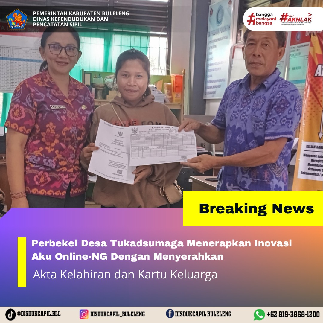 Pemerintah Kabupaten Buleleng melalui Dinas Kependudukan dan Pecatatan Sipil (Disdukcapil) Kabupaten Buleleng memaksimalkan serta mempermudah pelayanan kependudukan masyarakat dengan beberapa inovasi, melalui aplikasi AKU Online. Dimana dalam penerapan aplikasi Aku Online tersebut masyarakat tidak perlu lagi datang ke Dinas Dukcapil untuk melakukan pelayanan langsung cukup dengan datang ke Desa nanti akan dibantu oleh operator Desa masing-masing. Di Desa Tukadsumaga Kecamatan Gerokgak telah diserahkan dokumen kependudukan berupa Akta Kelahiran atas nama Ni Luh Putu Sri Antari dan Kartu Keluarga yang diserahkan oleh Perbekel Desa Tukadsumaga Kecamatan Gerokgak Anak Agung Sri Wathi, Selasa (30/9).