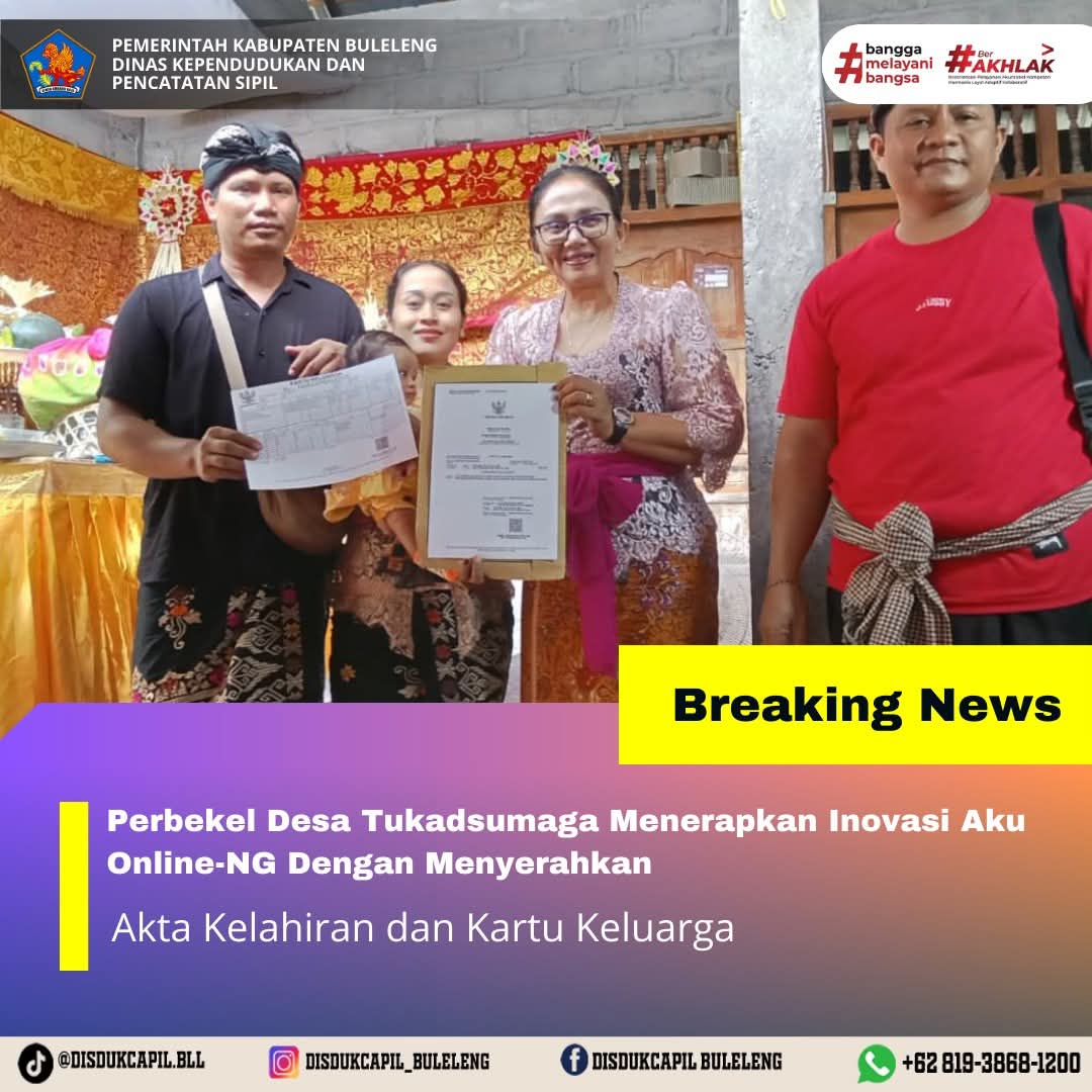 Pemerintah Kabupaten Buleleng melalui Dinas Kependudukan dan Pecatatan Sipil (Disdukcapil) Kabupaten Buleleng memaksimalkan serta mempermudah pelayanan kependudukan masyarakat dengan beberapa inovasi, melalui aplikasi AKU Online-NG. Dimana dalam penerapan aplikasi Aku Online-NG tersebut masyarakat tidak perlu lagi datang ke Dinas Dukcapil untuk melakukan pelayanan langsung cukup dengan datang ke Desa nanti akan dibantu oleh operator Desa masing-masing. Di Desa Tukadsumaga Kecamatan Gerokgak, telah diserahkan dokumen kependudukan berupa Akta Kelahiran atas nama Ni Kadek Sintya Aulia Pratiwi dan Kartu Keluarga yang diserahkan oleh Perbekel Desa Tukadsumaga Anak Agung Sri Wathi kepada warga Banjar Dinas Bulakan, Desa Tukadsumaga, Sabtu (22/11).