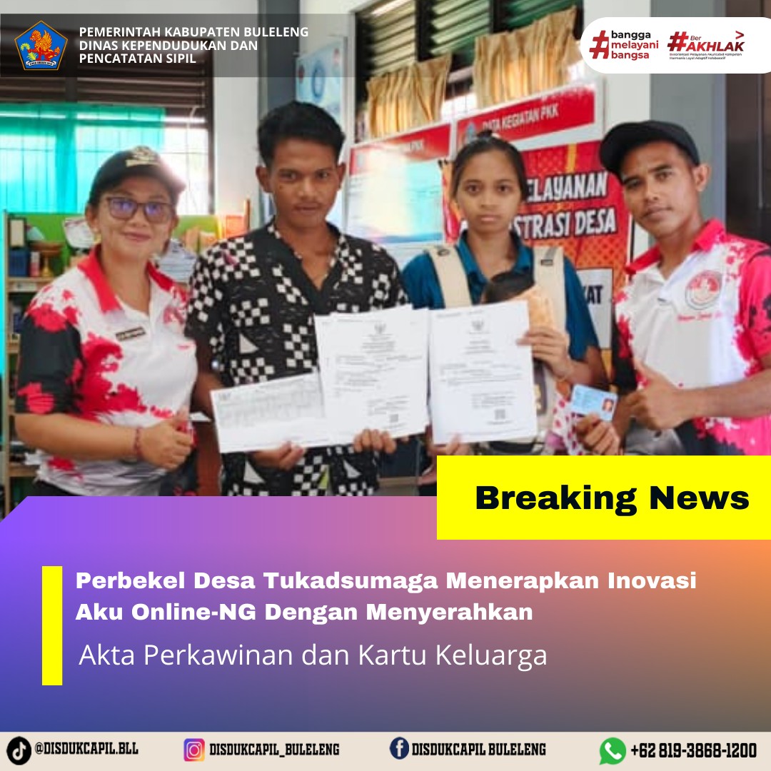 Pemerintah Kabupaten Buleleng melalui Dinas Kependudukan dan Pecatatan Sipil (Disdukcapil) Kabupaten Buleleng memaksimalkan serta mempermudah pelayanan kependudukan masyarakat dengan beberapa inovasi, melalui aplikasi AKU Online. Dimana dalam penerapan aplikasi Aku Online tersebut masyarakat tidak perlu lagi datang ke Dinas Dukcapil untuk melakukan pelayanan langsung cukup dengan datang ke Desa nanti akan dibantu oleh operator Desa masing-masing. Di Desa Tukadsumaga Kecamatan Gerokgak telah diserahkan dokumen kependudukan berupa Akta Perkawinan dan Kartu Keluarga atas nama I Komang Suastika warga Desa Tukadsumaga yang diserahkan secara langsung oleh Perbekel Desa Tukadsumaga Anak Agung Sri Wathi didampingi oleh Kelian Banjar Dinas Gandongan, Kecamatan Gerokgak, Jumat (19/9).