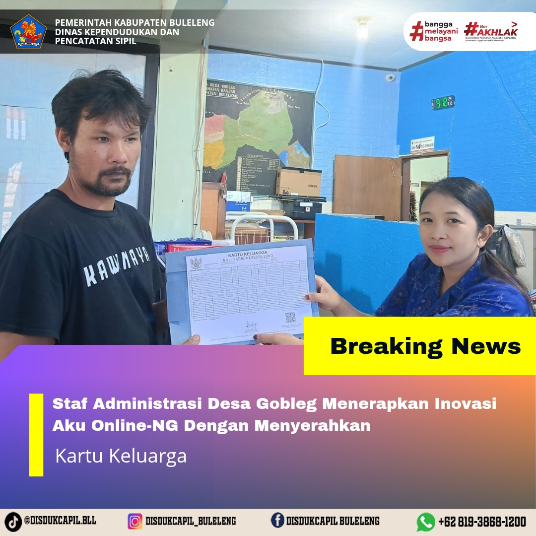 Pemerintah Kabupaten Buleleng melalui Dinas Kependudukan dan Pecatatan Sipil (Disdukcapil) Kabupaten Buleleng memaksimalkan serta mempermudah pelayanan kependudukan masyarakat dengan beberapa inovasi, melalui aplikasi AKU Online-NG. Dimana dalam penerapan aplikasi Aku Online-NG tersebut masyarakat tidak perlu lagi datang ke Dinas Dukcapil untuk melakukan pelayanan langsung cukup dengan datang ke Desa nanti akan dibantu oleh operator Desa masing-masing. Di Desa Gobleg Kecamatan Banjar, telah diserahkan dokumen kependudukan berupa Kartu Keluarga atas nama Nyoman Ari Susila yang diserahkan langsung oleh staf administrasi Desa Gobleg bertempat di Kantor Perbekel Desa Gobleg, Kecamatan Banjar, Kabupaten Buleleng, Selasa (12/8).