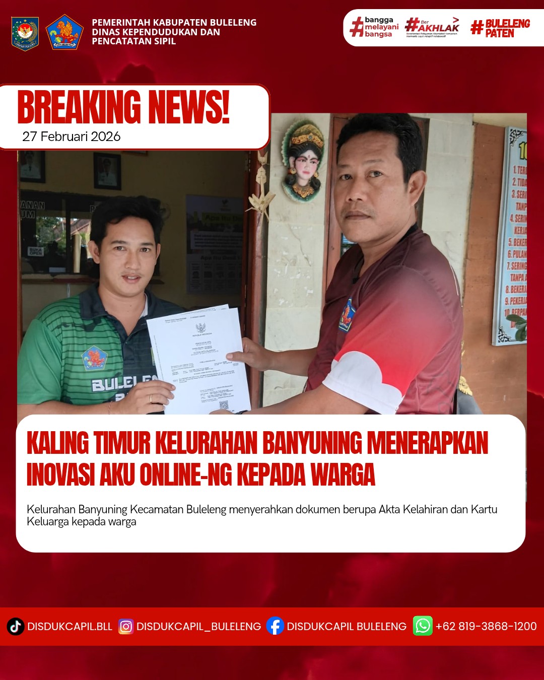 Pemerintah Kabupaten Buleleng melalui Dinas Kependudukan dan Pecatatan Sipil (Disdukcapil) Kabupaten Buleleng memaksimalkan serta mempermudah pelayanan kependudukan masyarakat dengan beberapa inovasi, melalui aplikasi AKU Online-NG. Dimana dalam penerapan aplikasi Aku Online-NG tersebut masyarakat tidak perlu lagi datang ke Dinas Dukcapil untuk melakukan pelayanan langsung cukup dengan datang ke Desa nanti akan dibantu oleh operator Desa masing-masing. Di Kelurahan Banyuning Kecamatan Buleleng, telah diserahkan dokumen kependudukan berupa Akta Kelahiran dan Kartu Keluarga warga Kelurahan Banyuning yang diserahkan langsung oleh Kaling Timur Kelurahan Banyuning Kecamatan Buleleng, Kabupaten Buleleng, Jumat (27/2).