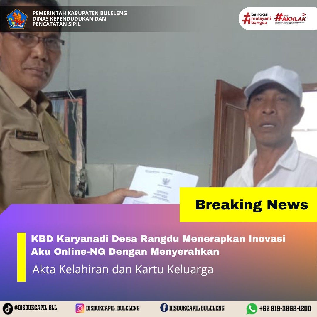 Pemerintah Kabupaten Buleleng melalui Dinas Kependudukan dan Pecatatan Sipil (Disdukcapil) Kabupaten Buleleng memaksimalkan serta mempermudah pelayanan kependudukan masyarakat dengan beberapa inovasi, melalui aplikasi AKU Online-NG. Dimana dalam penerapan aplikasi Aku Online-NG tersebut masyarakat tidak perlu lagi datang ke Dinas Dukcapil untuk melakukan pelayanan langsung cukup dengan datang ke Desa nanti akan dibantu oleh operator Desa masing-masing. Di Desa Rangdu Kecamatan Seririt, telah diserahkan dokumen kependudukan berupa Akta Kelahiran atas nama Kadek Aryani dan Kartu Keluarga atas nama Putu Ardika yang diserahkan langsung oleh Kelian Banjar Dinas Karyanadi Desa Rangdu Kecamatan Seririt, Senin (4/8).