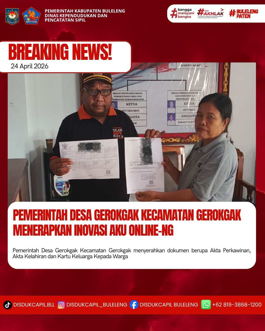 Pemerintah Kabupaten Buleleng melalui Dinas Kependudukan dan Pecatatan Sipil (Disdukcapil) Kabupaten Buleleng memaksimalkan serta mempermudah pelayanan kependudukan masyarakat dengan beberapa inovasi, melalui aplikasi AKU Online-NG. Dimana dalam penerapan aplikasi Aku Online-NG tersebut masyarakat tidak perlu lagi datang ke Dinas Dukcapil untuk melakukan pelayanan langsung, cukup dengan datang ke Desa nanti akan dibantu oleh operator Desa masing-masing. Di Desa Gerokgak Kecamatan Gerokgak, telah diserahkan dokumen kependudukan berupa :