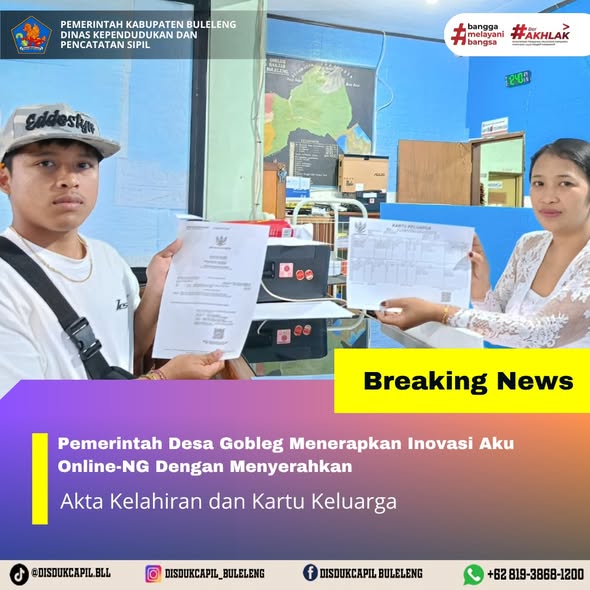 Pemerintah Kabupaten Buleleng melalui Dinas Kependudukan dan Pecatatan Sipil (Disdukcapil) Kabupaten Buleleng memaksimalkan serta mempermudah pelayanan kependudukan masyarakat dengan beberapa inovasi, melalui aplikasi AKU Online-NG. Dimana dalam penerapan aplikasi Aku Online-NG tersebut masyarakat tidak perlu lagi datang ke Dinas Dukcapil untuk melakukan pelayanan langsung cukup dengan datang ke Desa nanti akan dibantu oleh operator Desa masing-masing. Di Desa Gobleg Kecamatan Banjar, telah diserahkan dokumen kependudukan berupa Akta Kelahiran dan Kartu Keluarga atas nama Komang ARTAWAN yang diserahkan langsung oleh staf administrasi Desa Gobleg bertempat di Kantor Perbekel Desa Gobleg, Kecamatan Banjar, Kabupaten Buleleng, Rabu (05/11).