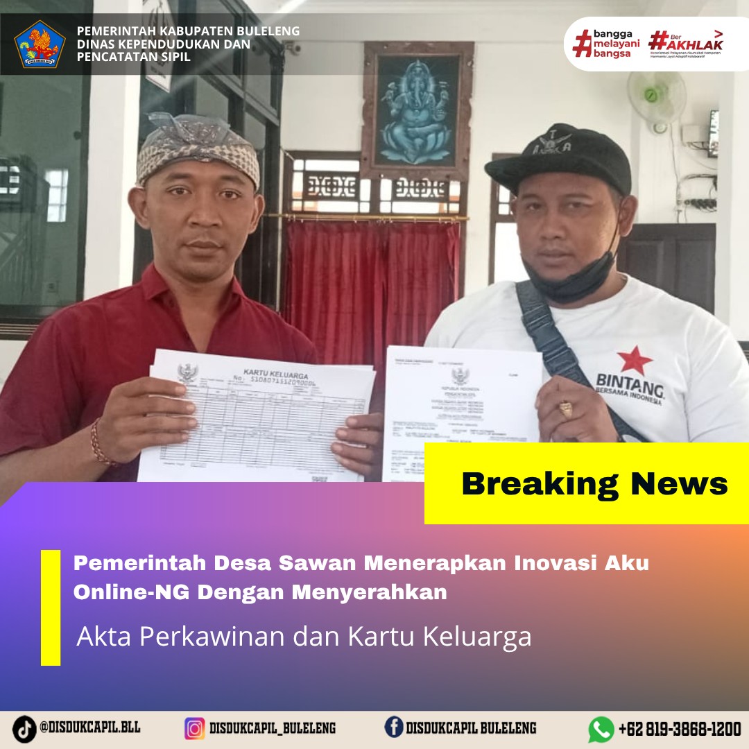 Pemerintah Kabupaten Buleleng melalui Dinas Kependudukan dan Pecatatan Sipil (Disdukcapil) Kabupaten Buleleng memaksimalkan serta mempermudah pelayanan kependudukan masyarakat dengan beberapa inovasi, melalui aplikasi AKU Online-NG. Dimana dalam penerapan aplikasi Aku Online-NG tersebut masyarakat tidak perlu lagi datang ke Dinas Dukcapil untuk melakukan pelayanan langsung cukup dengan datang ke Desa nanti akan dibantu oleh operator Desa masing-masing. Di Desa Sawan Kecamatan Sawan, telah diserahkan dokumen kependudukan berupa Akta Perkawinan dan Kartu Keluarga atas nama Komang Sedana yang diserahkan langsung oleh Operator Desa Sawan bertempat di Kantor Perbekel Desa Sawan, Kecamatan Sawan, Kabupaten Buleleng, Kamis (6/11).