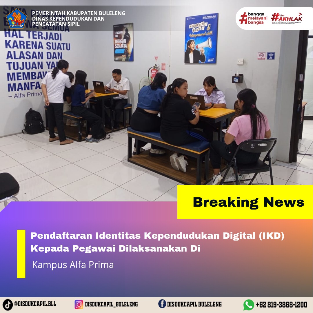 Menerapkan aturan pemerintah tersebut, Dinas Kependudukan dan Pencatatan Sipil Kabupaten Buleleng menyelenggarakan Pendaftaran Identitas Kependudukan Digital ke sekolah-sekolah, Dinas, Lembaga dan Perusahaan secara bergilir setiap harinya. Kali ini pelaksanaan pendaftaran Identitas Kependudukan Digital kepada pegawai yang dilaksanakan di Kampus Alfa Prima, Rabu (6/8).