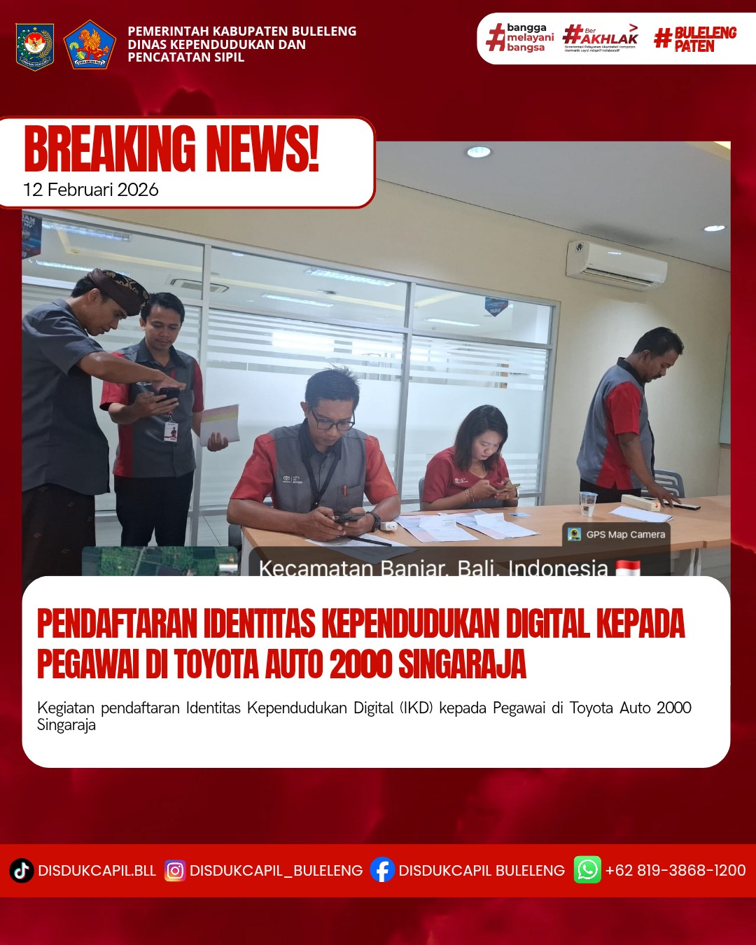 Menerapkan aturan pemerintah tersebut, Dinas Kependudukan dan Pencatatan Sipil Kabupaten Buleleng menyelenggarakan Pendaftaran Identitas Kependudukan Digital ke sekolah-sekolah, Dinas, Lembaga dan Perusahaan secara bergilir setiap harinya. Kali ini pelaksanaan pendaftaran Identitas Kependudukan Digital kepada Pegawai yang dilaksanakan di Toyota Auto 2000 Singaraja Desa Tukadmungga, Rabu (11/2).