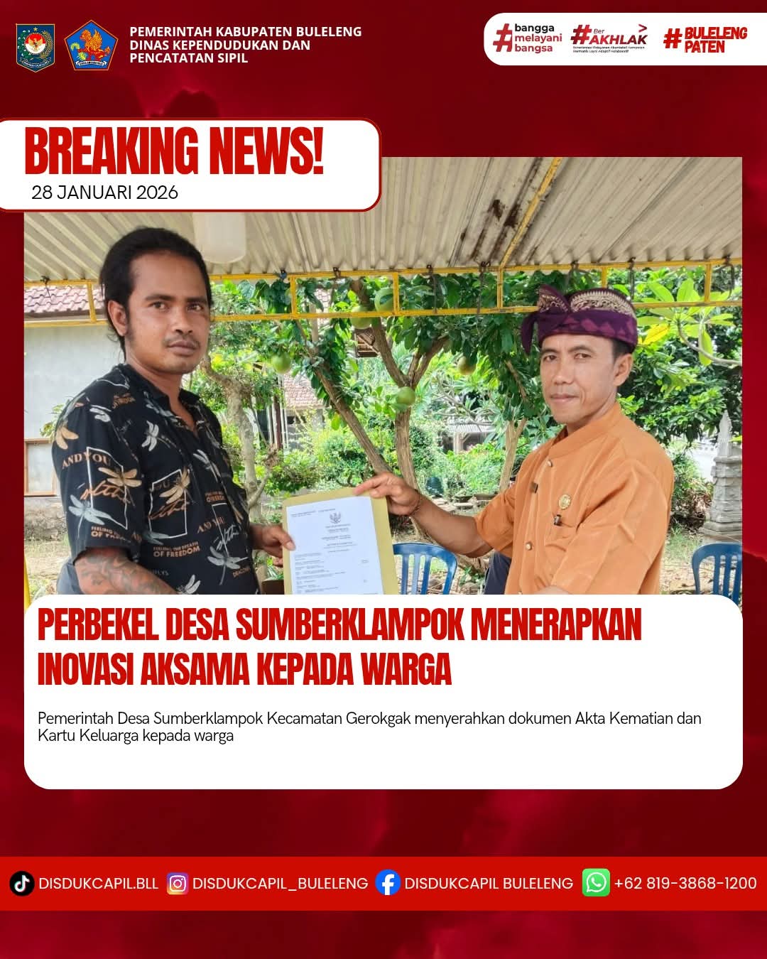 Pemerintah Kabupaten Buleleng melalui Dinas Kependudukan dan Pecatatan Sipil (Disdukcapil) Kabupaten Buleleng memaksimalkan serta mempermudah pelayanan kependudukan masyarakat dengan beberapa inovasi, yakni BALITA (Bayi Lahir Berakta), NYAKSI (Menyerahkan Akta Kawin Saat Acara Perkawinan) dan AKSAMA ( Akta Kematian Diserahkan Saat Masih Berduka) melalui aplikasi Aku Online-NG. Di Desa Sumberklampok Kecamatan Gerokgak, telah diterapkan program Aksama (Akta Kematian Diserahkan Saat Masih Berduka) yang dilakukan secara langsung oleh Perbekel Desa Sumberklampok I Wayan Sawitrayasa dengan menyerahkan Akta Kematian atas nama I Made Cenut dan Kartu Keluarga warga Bukit Sari Banjar Dinas Tegalbunder Desa Sumberklampok, Rabu (28/1).