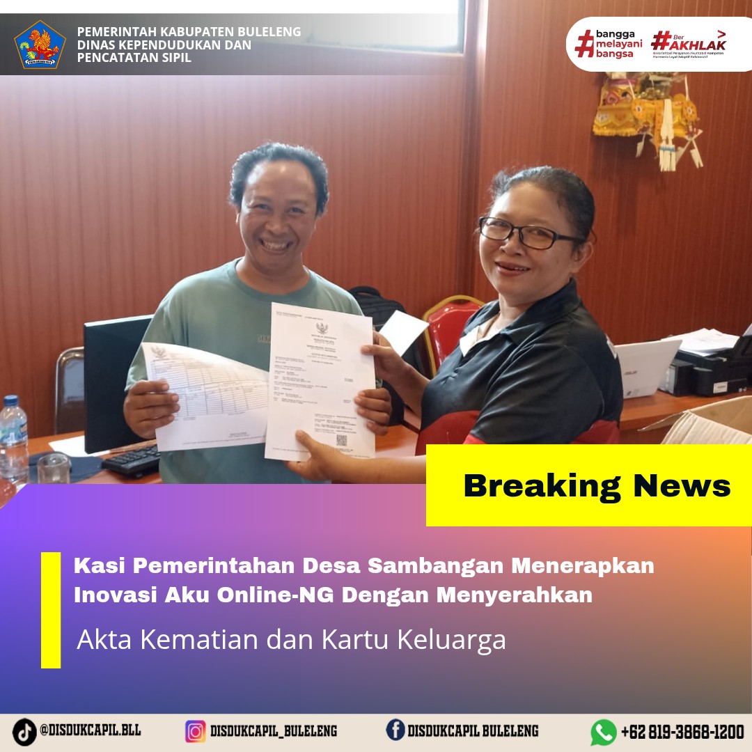 Pemerintah Kabupaten Buleleng melalui Dinas Kependudukan dan Pecatatan Sipil (Disdukcapil) Kabupaten Buleleng memaksimalkan serta mempermudah pelayanan kependudukan masyarakat dengan beberapa inovasi, melalui aplikasi AKU Online-NG. Dimana dalam penerapan aplikasi Aku Online-NG tersebut masyarakat tidak perlu lagi datang ke Dinas Dukcapil untuk melakukan pelayanan langsung cukup dengan datang ke Desa nanti akan dibantu oleh operator Desa masing-masing. Di Desa Sambangan Kecamatan Sukasada, telah diserahkan dokumen kependudukan berupa Akta Kematian atas nama Ketut Ardana dan Kartu Keluarga atas nama Kadek Suci Ariani kepada warga bertempat di Kantor Perbekel Desa Sambangan, Kecamatan Sukasada, Kabupaten Buleleng, Jumat (14/11).