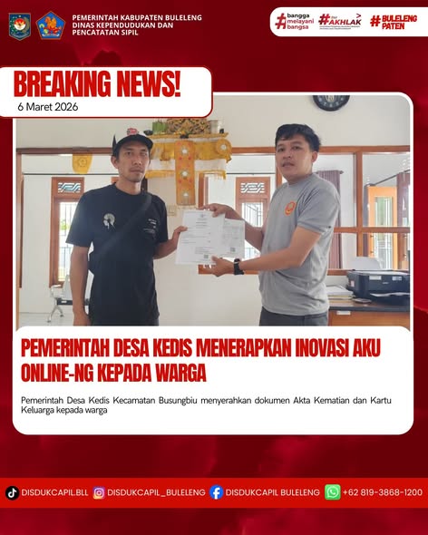 Pemerintah Kabupaten Buleleng melalui Dinas Kependudukan dan Pecatatan Sipil (Disdukcapil) Kabupaten Buleleng memaksimalkan serta mempermudah pelayanan kependudukan masyarakat dengan beberapa inovasi, melalui aplikasi AKU Online-NG. Dimana dalam penerapan aplikasi Aku Online-NG tersebut masyarakat tidak perlu lagi datang ke Dinas Dukcapil untuk melakukan pelayanan langsung cukup dengan datang ke Desa nanti akan dibantu oleh operator Desa masing-masing. Di Desa Kedis Kecamatan Busungbiu, telah diserahkan dokumen kependudukan berupa Akta Kematian warga Banjar Dinas Kelod, yang diserahkan langsung oleh Kasi Pemerintahan Desa Kedis Kadek Dita Yudistira, Jumat(6/3).