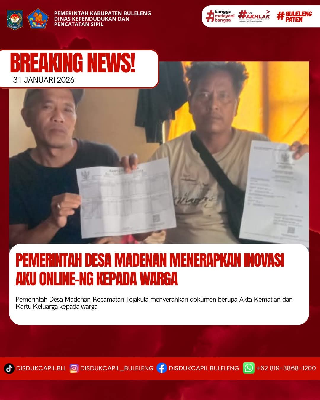 Pemerintah Kabupaten Buleleng melalui Dinas Kependudukan dan Pecatatan Sipil (Disdukcapil) Kabupaten Buleleng memaksimalkan serta mempermudah pelayanan kependudukan masyarakat dengan beberapa inovasi, melalui aplikasi AKU Online-NG. Dimana dalam penerapan aplikasi Aku Online-NG tersebut masyarakat tidak perlu lagi datang ke Dinas Dukcapil untuk melakukan pelayanan langsung cukup dengan datang ke Desa nanti akan dibantu oleh operator Desa masing-masing. Di Desa Madenan Kecamatan Tejakula, telah diserahkan dokumen kependudukan berupa Akta Kematian atas nama Nyoman Tisning dan Kartu Keluarga atas nama Wayan Urip yang diserahkan langsung oleh Kelian Banjar Dinas Gentuh, Desa Madenan Kecamatan Tejakula, Kabupaten Buleleng, Sabtu (31/1).