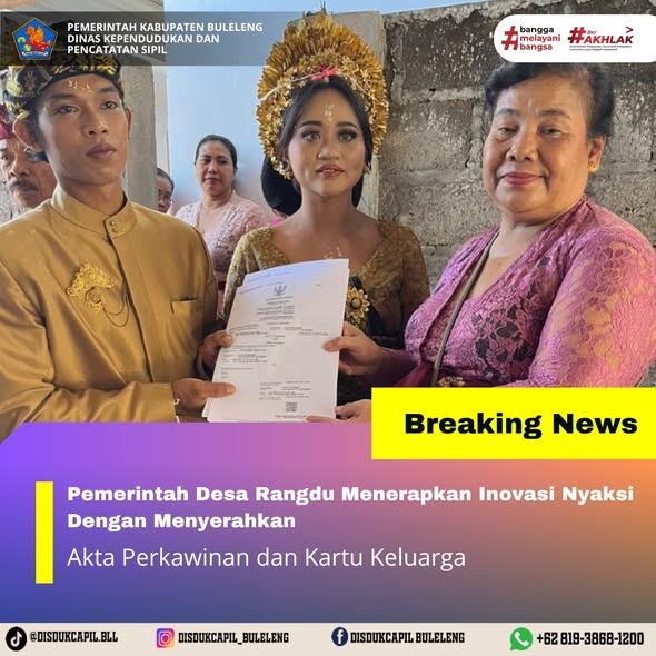 Pemerintah Kabupaten Buleleng melalui Dinas Kependudukan dan Pecatatan Sipil (Disdukcapil) Kabupaten Buleleng memaksimalkan serta mempermudah pelayanan kependudukan masyarakat dengan beberapa inovasi, yakni BALITA (Bayi Lahir Berakta), NYAKSI (Menyerahkan Akta Kawin Saat Acara Perkawinan) dan AKSAMA ( Akta Kematian Diserahkan Saat Masih Berduka) melalui aplikasi Aku Online-NG. Di Desa Rangdu Kecamatan Seririt, telah diterapkan program NYAKSI (Menyerahkan Akta Perkawinan Saat Acara Perkawinan) yang dilakukan secara langsung oleh Kasi Pemerintahan dengan menyerahkan Akta Perkawinan atas nama Ketut Sumiarsa dengan Kadek Sukreni dan Kartu Keluarga kepada kedua mempelai dan masing-masing orang tua mempelai di Desa Rangdu Kecamatan Seririt, Senin (`10/11).