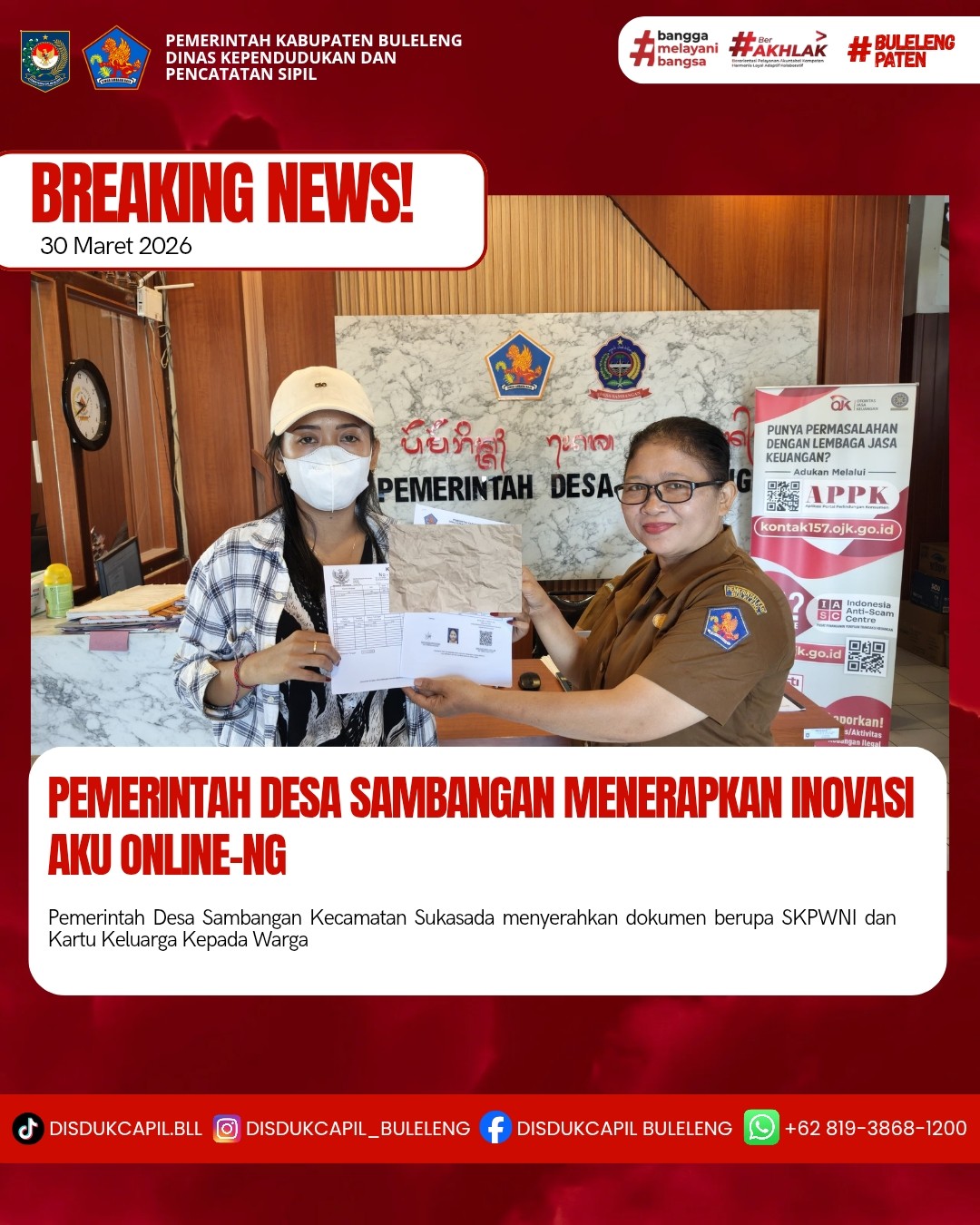 Pemerintah Kabupaten Buleleng melalui Dinas Kependudukan dan Pecatatan Sipil (Disdukcapil) Kabupaten Buleleng memaksimalkan serta mempermudah pelayanan kependudukan masyarakat dengan beberapa inovasi, melalui aplikasi AKU Online-NG. Dimana dalam penerapan aplikasi Aku Online-NG tersebut masyarakat tidak perlu lagi datang ke Dinas Dukcapil untuk melakukan pelayanan langsung, cukup dengan datang ke Desa nanti akan dibantu oleh operator Desa masing-masing. Di Desa Sambangan Kecamatan Sukasada, telah diserahkan dokumen kependudukan berupa SKPWNI atas nama Putu Wanda Aristayanti dan Kartu Keluarga warga BD. Babakan diserahkan oleh Kasi Pemerintahan Desa Sambangan yang bertempat di Kantor Perbekel Desa Sambangan, Kecamatan Sukasada, Kabupaten Buleleng, Senin (30/3).
