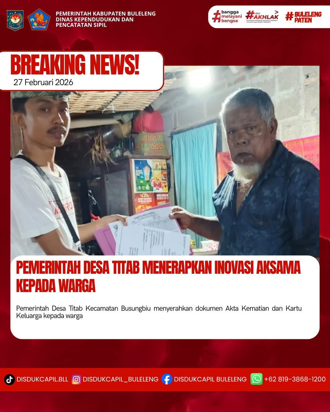 Pemerintah Kabupaten Buleleng melalui Dinas Kependudukan dan Pecatatan Sipil (Disdukcapil) Kabupaten Buleleng memaksimalkan serta mempermudah pelayanan kependudukan masyarakat dengan beberapa inovasi, yakni BALITA (Bayi Lahir Berakta), NYAKSI (Menyerahkan Akta Kawin Saat Acara Perkawinan) dan AKSAMA ( Akta Kematian Diserahkan Saat Masih Berduka) melalui aplikasi Aku Online-NG. Di Desa Titab Kecamatan Busungbiu, telah diterapkan program Aksama (Akta Kematian Diserahkan Saat Masih Berduka) yang dilakukan secara langsung oleh Kasi Pemerintahan Desa Titab dengan menyerahkan Akta Kematian atas nama Luh Kartini dan Kartu Keluarga atas nama Ketut Tandur kepada keluarga almarhum di Banjar Dinas Baledana, Desa Titab, Kecamatan Busungbiu, Jumat (27/2).