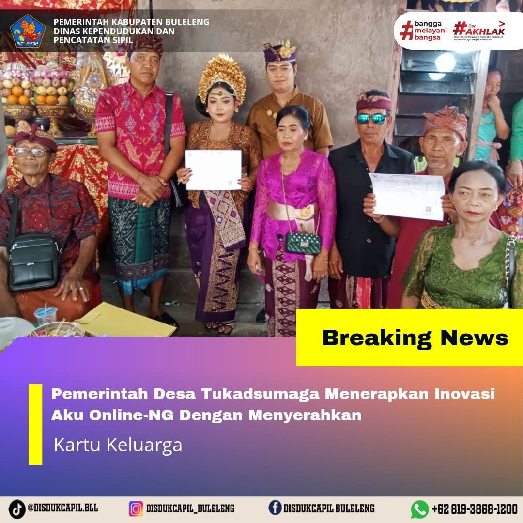 Pemerintah Kabupaten Buleleng melalui Dinas Kependudukan dan Pecatatan Sipil (Disdukcapil) Kabupaten Buleleng memaksimalkan serta mempermudah pelayanan kependudukan masyarakat dengan beberapa inovasi, melalui aplikasi AKU Online. Dimana dalam penerapan aplikasi Aku Online tersebut masyarakat tidak perlu lagi datang ke Dinas Dukcapil untuk melakukan pelayanan langsung cukup dengan datang ke Desa nanti akan dibantu oleh operator Desa masing-masing. Di Desa Tukadsumaga Kecamatan Gerokgak telah diserahkan dokumen kependudukan berupa Kartu Keluarga atas nama Ni Putu Erna Sari karena pindah domisili dan Kartu Keluarga atas nama I Ketut Arnawa yang diserahkan oleh Kelian Banjar Dinas Yehmas Desa Tukadsumaga, Kecamatan Gerokgak, Rabu (24/9).