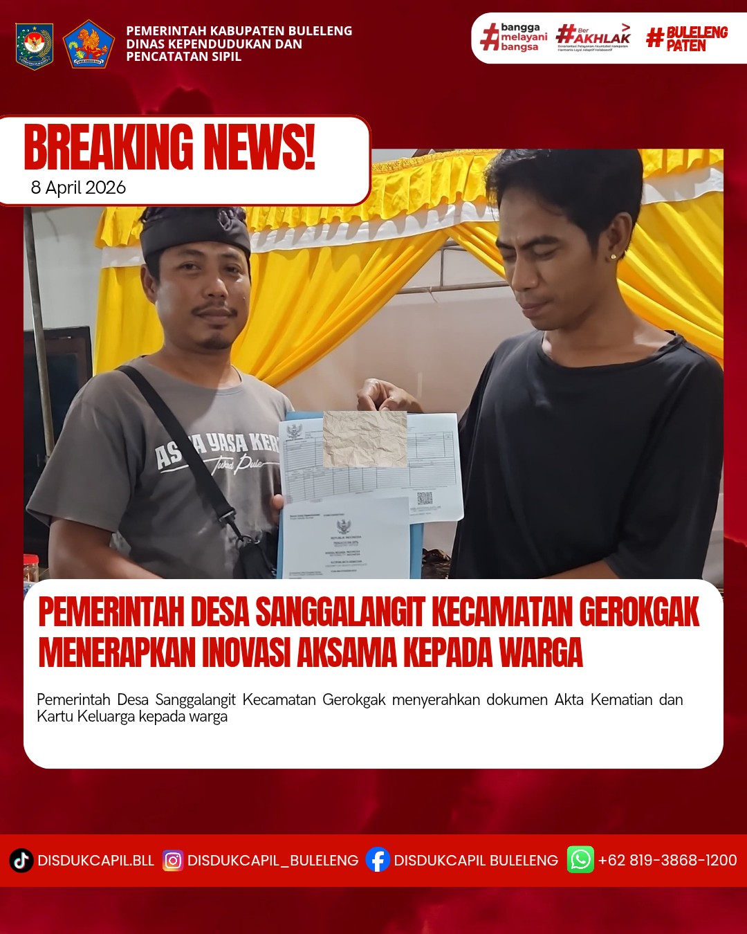 Pemerintah Kabupaten Buleleng melalui Dinas Kependudukan dan Pecatatan Sipil (Disdukcapil) Kabupaten Buleleng memaksimalkan serta mempermudah pelayanan kependudukan masyarakat dengan beberapa inovasi, yakni BALITA (Bayi Lahir Berakta), NYAKSI (Menyerahkan Akta Kawin Saat Acara Perkawinan) dan AKSAMA (Akta Kematian Diserahkan Saat Masih Berduka) melalui aplikasi Aku Online. Di Desa Sanggalangit Kecamatan Gerokgak, telah diterapkan program Aksama (Akta Kematian Diserahkan Saat Masih Berduka) yang dilakukan secara langsung oleh Pemerintah Desa Sanggalangit dengan menyerahkan Akta Kematian dan Kartu Keluarga kepada I Wayan Sudarsana di Banjar Dinas Tukadpule Desa Sanggalangit Kecamatan Gerokgak, Rabu (8/4).
