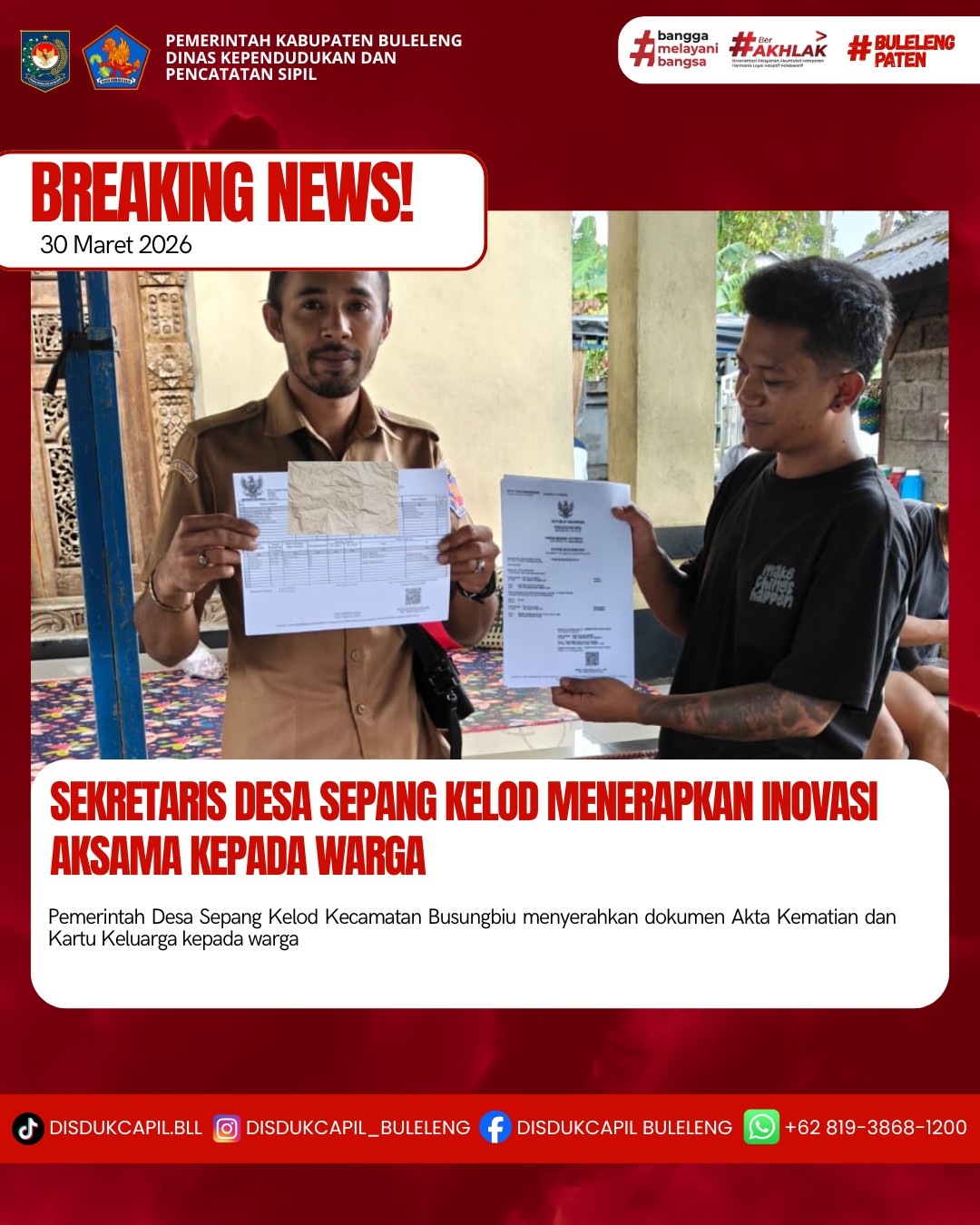 Pemerintah Kabupaten Buleleng melalui Dinas Kependudukan dan Pecatatan Sipil (Disdukcapil) Kabupaten Buleleng memaksimalkan serta mempermudah pelayanan kependudukan masyarakat dengan beberapa inovasi, yakni BALITA (Bayi Lahir Berakta), NYAKSI (Menyerahkan Akta Kawin Saat Acara Perkawinan) dan AKSAMA (Akta Kematian Diserahkan Saat Masih Berduka) melalui aplikasi Aku Online-NG. Di Desa Sepang Kelod Kecamatan Busungbiu, telah diterapkan program Aksama (Akta Kematian Diserahkan Saat Masih Berduka) yang dilakukan secara langsung oleh Sekretaris Desa Sepang Kelod dengan menyerahkan Akta Kematian dan Kartu Keluarga kepada keluarga almarhum Banjar Dinas Bujak di Desa Sepang Kelod, Senin (30/3).